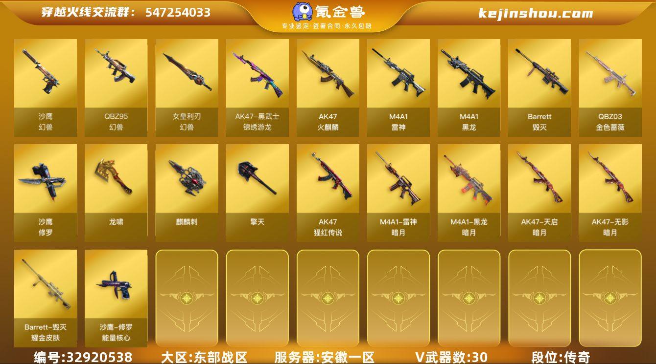 【ky6605】安徽一区-30V-0王者武器数-0炫金武器数 【热门武器】:QBZ03-金色蔷薇,死亡之眼*2,沙鹰-修罗,高爆手雷-幻兽*3 【皮肤】:雷神-暗月,雷神-源计划2.0专属 皮肤,毁灭耀金皮肤,毁灭-英雄计划 皮肤,黑龙-暗月,无影-暗月*2,天启-暗月,修罗-能量核心,天神-暗月 【角色】:北极狐-X,风暴女,嘉年华灵狐,娟娟,龙儿,潘多拉-X,潘多拉-甜心教官,潜龙队-X,斯沃特-X,铁骑荣耀,新娜塔莎,雪莉杨-摸金校尉,影武者-X,游珑儿 【人偶武器】:AWM-灵狐-15周年嘉年华,迷你深渊冰龙,迷你裂空之翼,迷你波特博士*3,深渊终结者手雷 【暴走生化】:死亡之眼*2 【挑战大师】:神圣爆裂者III,激光毁灭者III-白马银枪,激光毁灭者III 【英雄级武器】:AK47-火麒麟,M4A1-黑龙,M4A1-雷神,黑武士-锦绣游龙,QBZ95-幻兽,QBZ03-金色蔷薇,AK-47-猩红传说,Barrett-毁灭,沙鹰-修罗,沙鹰-幻兽*3,龙啸,擎天,麒麟刺,女皇利刃-幻兽,高爆手雷-幻兽*3,闪光弹-幻兽*3,烟雾弹-幻兽*3,AK47-竞魂无影 【源级武器】:源-千变,源·火麒麟,御·火麒麟-平天大圣,魂·M4A1-雷神-化蛇,魂·雷神-神秘按键,魂·雷神-维纳斯,魂-雷神-萌杀,魂·雷神-15周年嘉年华,御·雷神-机甲刑...