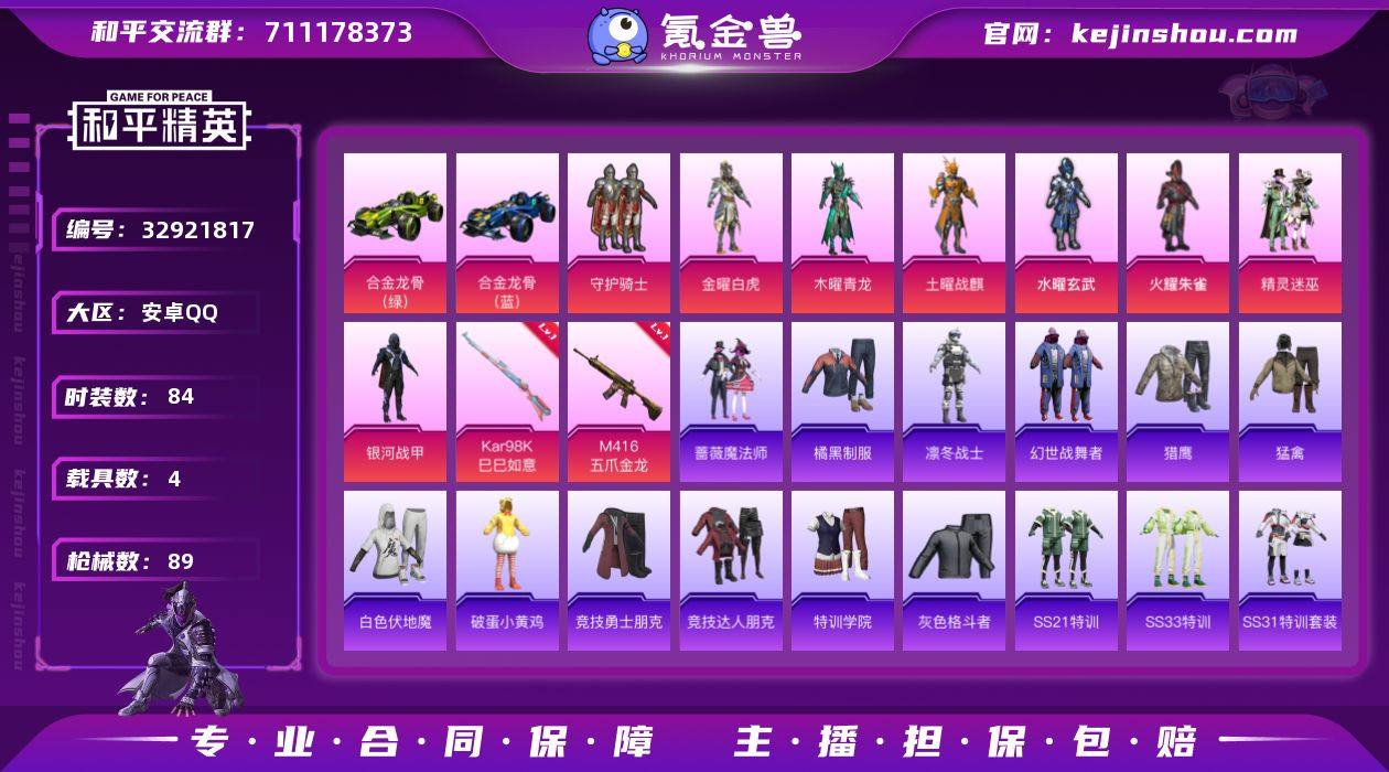 【M4五爪金龙4载具8粉装2特效枪 秒换绑不用等】 安卓Q区-38069热力值--84套装-89枪皮 【4载具】 玛莎拉蒂粉色 玛莎拉蒂蓝色 合金龙骨蓝色 合金龙骨绿色【7粉装】 银河战甲 精灵迷巫 火曜朱雀 水曜玄武 土曜战麒 木曜青龙 金曜白虎 守护骑士【2特效枪】 M416-五爪金龙(6级) Kar98K-巳巳如意(1级)【66热门】 雪山精英(老6服) 破蛋小黄鸡 白色伏地魔 SS9特训 SS8特训 SS6特训 SS10特训 M762-乌木金纹 M416-乌木金纹 GROZA-乌木金纹 M762-天降萌叽 M416-夜灯 MG3-幻世战舞者 AKM-霓虹街区 M416-蓝色火焰 GROZA-春暖花开 长空猛禽 银河战甲 维京奇缘 特训学院 青年教官 平底锅-五爪金龙 霓虹街区 魅力单车 凛冬战士 猎鹰 蓝色运动 酷萌兔限定 橘黑制服 竞技勇士朋克 竞技达人朋克 灰色格斗者 黄色运动 黄色格斗者 黄色伏地魔 幻世尖兵 红色运动 黑色伏地魔 蔷薇魔法师 M24-奇异狩猎者 SS7特训 SS12特训 大橘大利 SS13特训 SS14特训 SS28特训 海盐绵绵冰 SS31特训 SS33特训 SS32特训 战术大师 G36C-星穹咏叹调 P92-拳皇97 P1911-冰封烈焰 平底锅-拳皇97 平底锅-冰封烈焰 机械哨兵 M417-玩趣呆呆 撬棍-绯红前夜 撬棍-传奇侦探 平底锅-黑色刀锋 撬棍-雪国精灵 平底锅-勇闯险境 黑色刀...