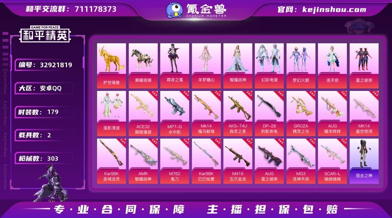 【梦幻火箭16特效枪8粉装2载具 秒换绑不用等】 安卓Q区-98421热力值-11印记-179套装-303枪皮 【2载具】 护世瑞兽 黑曜夜骑【2稀有】 Mark.06蓝螳螂 8号机粉螳螂【8粉装】 梦幻火箭 洛天依 星之彼岸 罪夜之冕 莲影清波 角色-智耀战神 幻彩电音 角色-羊梦糖心【16特效枪】 Kar98K-圣域龙灵(3级) Mk14-盛世惊鸿(3级) GROZA-精灵之光(3级) M416-五爪金龙(7级) AKS-74U-森灵之息(5级) Mk14-福马献瑞(2级) ACE32-萌骑漫游(3级) MP7-G-水中影(2级) SCAR-L-锦绣绵绵(5级) AUG-星之彼岸(6级) MG3-洛神天依(6级) AMR-智耀战神(5级) Kar98K-巳巳如意(5级) M762-鬼刀(4级) AUG-暖羊咩咩(5级) DP-28-豹影疾电(5级)【274热门】 AG战队服 雪山精英(老6服) 鹰眼刺客 团圆交子 瑞龙福将 忍者信条 白色伏地魔 SS6特训 SS27特训 SS26特训 SS22特训 SS10特训 Mk47-洛神天依 Mini14-梦幻火箭 AWM-不夜海上花 AWM-飒粉甜心 M416-乌木金纹 GROZA-乌木金纹 SCAR-L-玉兔迎春 GROZA-田园牧歌 AUG-幻影战神 M762-天降萌叽 Mk47-乌木金纹 UZI-娇憨猪猪 UMP45-炫光之旅 AKM-虎虎生威 AKM-霓虹街区 AKM-星之彼岸 M416-蓝色火焰 GROZA-异彩先驱 GROZA-彩虹符号 M762-镭射皇者 长空猛禽 异彩先驱 牛气冲天 霓虹...