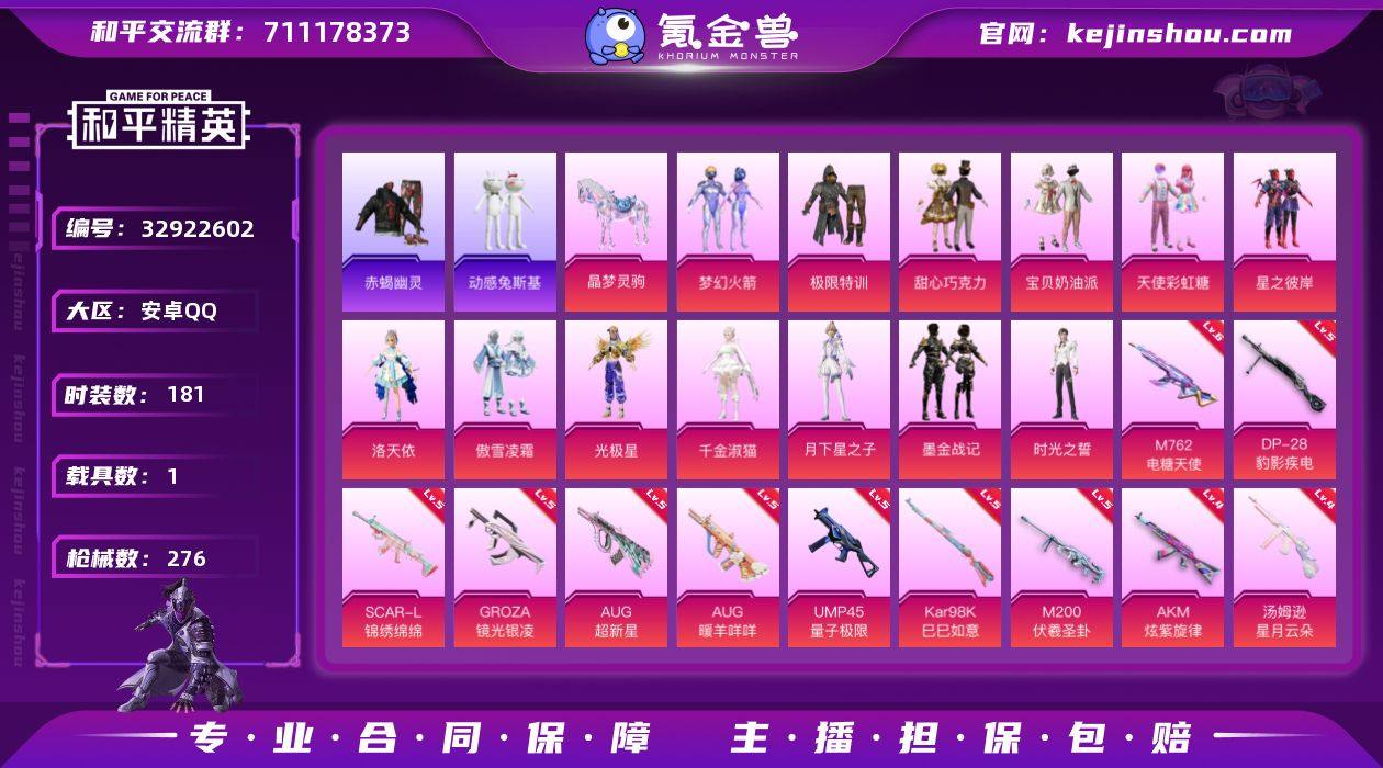 全女号 番茄 赤蝎幽灵 粉熊背包 眼罩 满级地铁安卓 手Q-13粉装-26特效枪-1载具-6粉色飞行器-87594热力值-14王牌印记-181套装-276枪皮 【热门品类】:粉装-梦幻火箭,套装-浪漫天命,套装-赤蝎幽灵,角色-军刀雅典娜,套装-动感兔斯基人偶服,套装-AG战队服,套装-龟仙人,套装-暗影哥特,套装-糯粉咩咩,角色-Mark.06,套装-红熊茄茄 【粉色套装】:粉装-极限特训,粉装-甜心巧克力,粉装-宝贝奶油派,粉装-天使彩虹糖,粉装-梦幻火箭,粉装-星之彼岸,角色-洛天依,粉装-傲雪凌霜,角色-光极星,角色-千金淑猫,角色-月下星之子,粉装-墨金战记,角色-时光之誓 【粉色枪皮等级】:AKM-炫紫旋律(四级),SCAR-L-锦绣绵绵(五级),M416-心之恋语(一级),M416-天马神君(三级),GROZA-镜光银凌(五级),GROZA-旋星之夜(三级),AUG-超新星(五级),AUG-暖羊咩咩(五级),M762-电糖天使(六级),UMP45-量子极限(五级),Vector-环太平洋(三级),汤姆逊-星月云朵(四级),AKS-74U-森灵之息(四级),P90-沙丘之主(二级),Kar98K-巳巳如意(五级),Mk14-爆裂游戏(二级),Mk14-福马献瑞(四级),AMR-鸢尾晶梦(二级),M200-伏羲圣卦(五级),AA12-G-萌骑幻想(二级),DP-28-豹影疾电(五级),MG3-洛神...