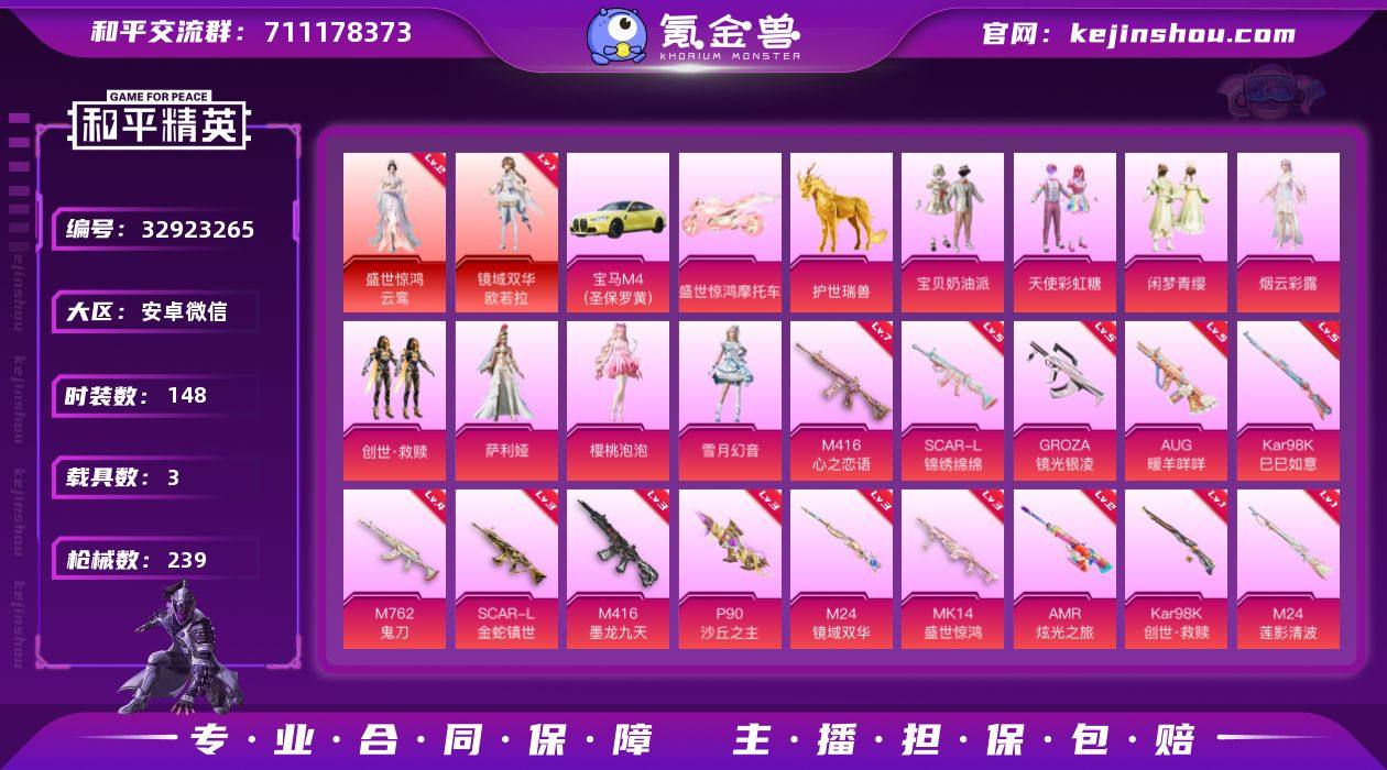 DAS11044 可二次 安卓V-2红装1稀有3载具8粉装16特效枪10热门148套装239枪皮 85755热力值 12印记 历史卓越王牌10星 盛世惊鸿-云鸾 (2级) 镜域双华-欧若拉 (1级) 宝贝奶油派 天使彩虹糖 SCAR-L-金蛇镇世 (3级) Mk14-盛世惊鸿 (3级)M24-镜域双华 (3级) 【2红装】 盛世惊鸿-云鸾 (2级) 镜域双华-欧若拉 (1级) 【1稀有】 SCAR-L-粉色回忆 【3载具】 宝马M4(圣保罗黄) 护世瑞兽 盛世惊鸿摩托车 【8粉装】 萨利娅 宝贝奶油派 天使彩虹糖 雪月幻音 烟云彩露 樱桃泡泡 创世救赎 闲梦青缨 【16特效枪】 SCAR-L-金蛇镇世 (3级) SCAR-L-锦绣绵绵 (5级) M416-心之恋语 (7级) M416-墨龙九天 (3级) P90-沙丘之主 (3级) Kar98K-巳巳如意 (5级) M762-鬼刀 (4级) AUG-暖羊咩咩 (5级) PKM-江南烟雨 (1级) Mk14-盛世惊鸿 (3级) Mk14-闲梦青缨 (1级) AMR-炫光之旅 (2级) M24-镜域双华 (3级) GROZA-镜光银凌 (5级) Kar98K-创世救赎 (1级) M24-莲影清波 (1级) 【10热门】 奇迹天团 雪山精英 奇迹天团 大橘为重 暗夜契约 白虎圣者 机械英豪 破蛋小黄鸡 黑色刀锋 M24-香水柠檬 【3飞行器】 龙翔九天飞行器 梦幻火箭飞行器 四圣焕新飞行器 【3头盔】 梦幻火箭头盔 折纸暴龙头盔 甜心宝贝头盔...