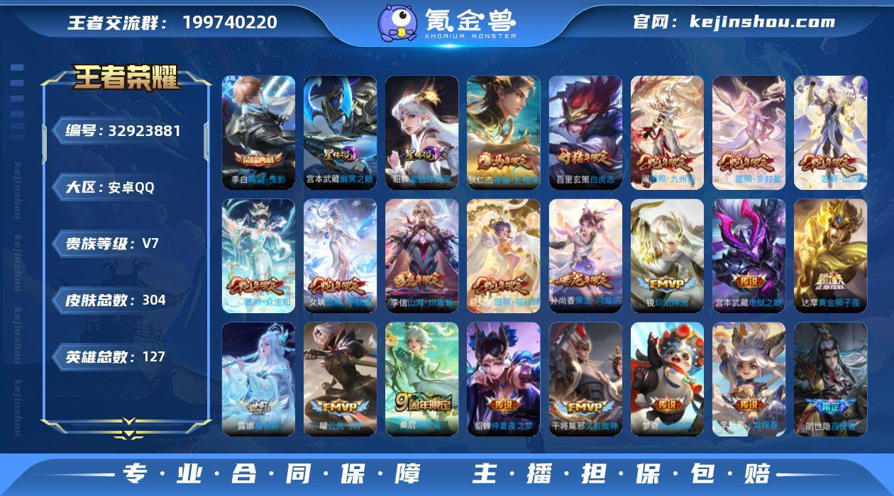 AHC80041 有钱包 安卓Q-V7-最强王者段位-127英雄-304皮肤-1典藏皮肤-20传说-96史诗 【英雄全皮】:孙权全皮,敖隐全皮,司空震全皮,空空儿全皮 【荣耀典藏】:李白鸣剑曳影 【传说皮肤】:狄仁杰神骥赴朔漠,司空震愿照山河定,女娲愿照千秋盛,妲己愿照众生和,澜愿照九州拓,蔡文姬愿照福禄聚,虞姬愿照岁时盈,桑启鸣野蒿,孙尚香乘龙问璇玑,露娜霜月吟,李信山海炽霜斩,李元芳飞鸢探春,镜炽阳神光,曜云鹰飞将,干将莫邪久胜战神,达摩黄金狮子座,百里玄策白虎志,梦奇胖达荣荣,貂蝉仲夏夜之梦,宫本武藏地狱之眼 【限定皮肤】:姜子牙天穹之誓,杨戬破阵退雄兵,李白谪仙醉月,狄仁杰阴阳师,赵云皇家上将,墨子神迹守卫,孙尚香蔷薇恋人,庄周高山流水,元歌云间偶戏,元歌无心,甄姬游园惊梦,典韦岱宗,马可波罗暗影游猎,马可波罗山海玄木吟,狄仁杰魔术师,狄仁杰万华元夜,达摩沙漠行僧,项羽海滩派对,老夫子醍醐杖,老夫子航海奇遇记,程咬金演武夺筹,兰陵王金庭之子,花木兰青春决赛季,孙悟空孙行者,后羿圣弓游侠,李元芳云中旅人,钟馗驱傩正仪,干将莫邪真爱魔法,雅典娜黎明之约,鬼谷子原初探秘者,鬼谷子五谷丰年,苏烈千军破阵,百里玄策白虎...