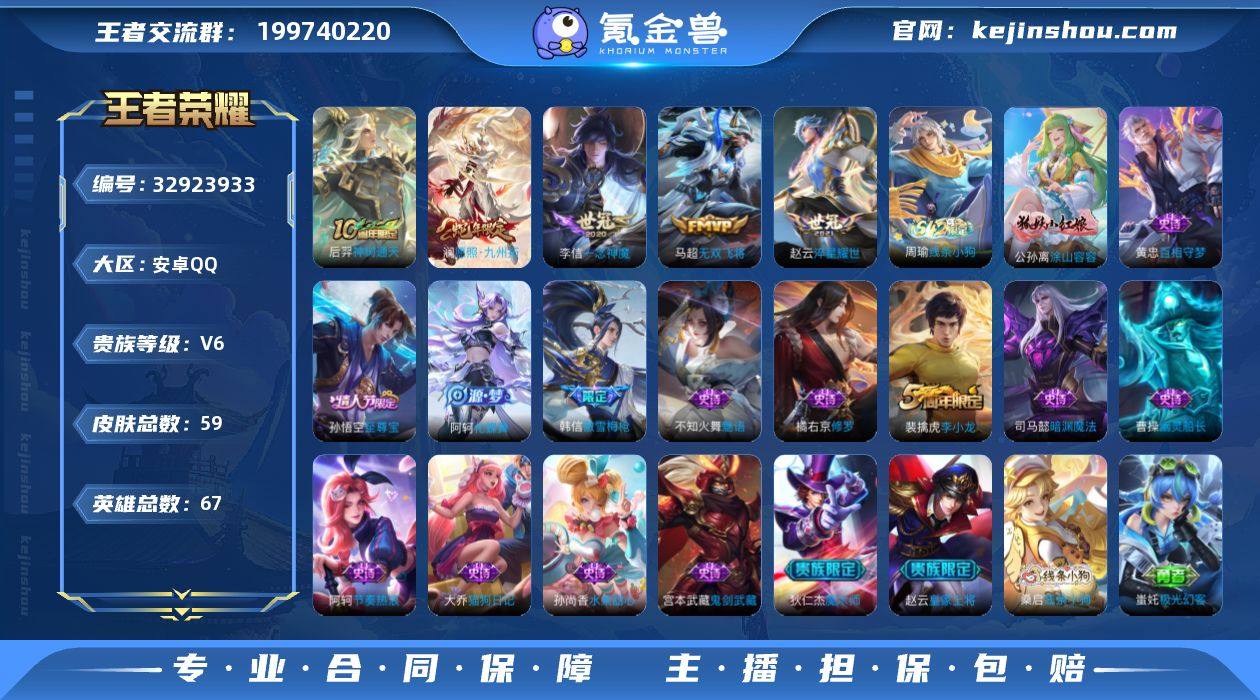 无二次安卓Q-V6-永恒钻石II段位-67英雄-59皮肤-5传说-16史诗TD2602119 【传说皮肤】:后羿神树通天,澜愿照九州拓,马超无双飞将,赵云淬星耀世,李信一念神魔 【限定皮肤】:狄仁杰阴阳师,赵云皇家上将,狄仁杰魔术师,项羽海滩派对,韩信傲雪梅枪,孙悟空至尊宝,裴擒虎李小龙 【年限皮肤】:澜愿照九州拓 【赛季限定】:太乙真人谧流熔炉,钟馗虚灵犬护,甄姬逆浪荇歌,亚瑟荣光之誓 【战令限定】:周瑜线条小狗 【史诗皮肤】:赵云皇家上将,狄仁杰魔术师,宫本武藏鬼剑武藏,孙尚香水果甜心,曹操幽灵船长,孙悟空至尊宝,阿轲节奏热浪,大乔猫狗日记,不知火舞魅语,橘右京修罗,裴擒虎李小龙,司马懿暗渊魔法,韩信傲雪梅枪,阿轲化蝶舞,黄忠百相守梦,公孙离涂山容容,周瑜线条小狗 【其他皮肤】:项羽海滩派对,韩信街头霸王,白起白色死神,宫本武藏未来纪元,典韦黄金武士,甄姬花好人间,宫本武藏万象初新,狄仁杰阴阳师,刘备汉昭烈帝,孙尚香沉稳之力,苏烈坚韧之力,典韦铁甲之心,蒙犽胡桃狂想曲,太乙真人谧流熔炉,达摩爆裂喵拳,少司缘灵卦秘语,明世隐景韶洛都,戈娅玫蓝誓约,钟馗虚灵犬护,阿古朵布丁狗之约,白起死霸装,甄姬逆浪荇歌,亚瑟荣光之誓...