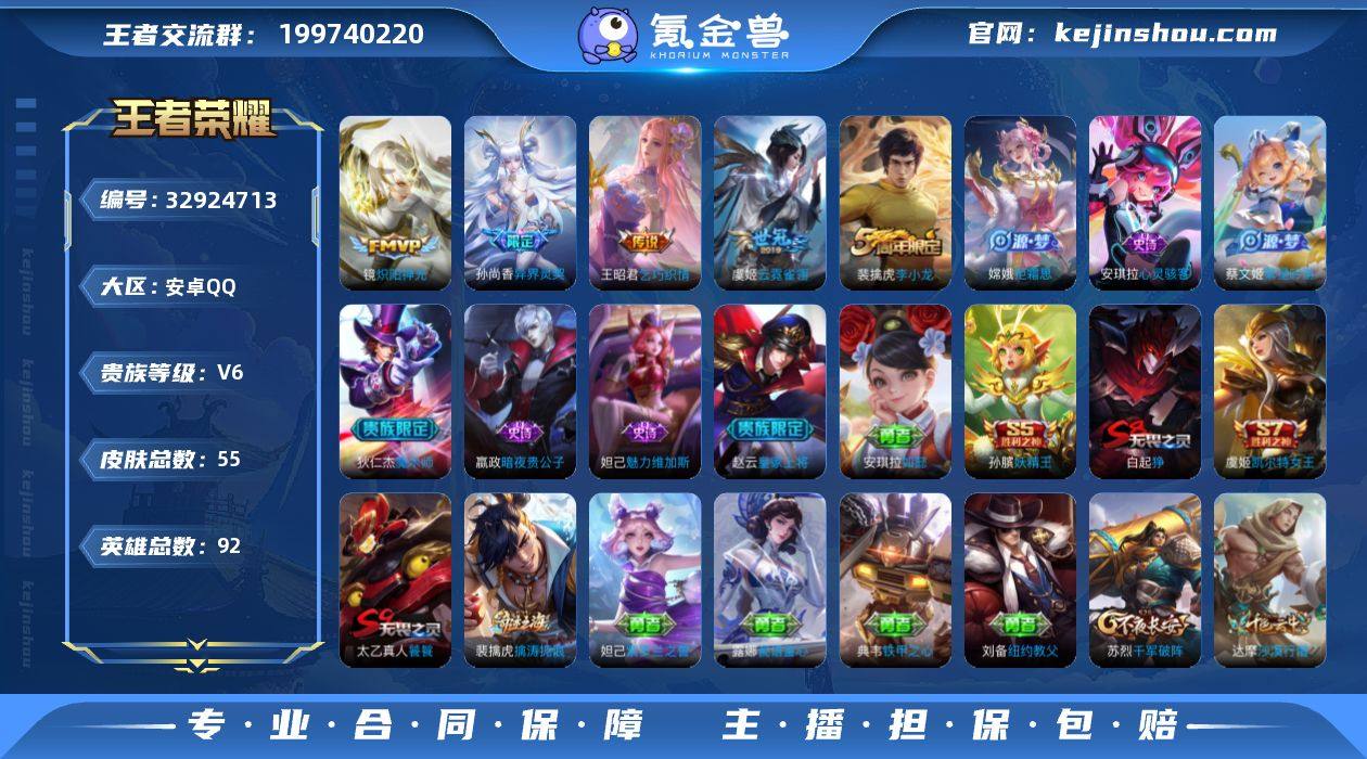 W15724 可立即换绑无需挂单养号 铭文满级 传说4 夺宝36 安卓Q-V6-秩序白银III段位-92英雄-55皮肤-4传说-8史诗 【传说皮肤】:孙尚香异界灵契,王昭君乞巧织情,镜炽阳神光,虞姬云霓雀翎 【限定皮肤】:白起狰,狄仁杰阴阳师,虞姬凯尔特女王,赵云皇家上将,孙尚香异界灵契,孙膑妖精王,狄仁杰魔术师,狄仁杰万华元夜,达摩沙漠行僧,项羽海滩派对,亚瑟潮玩骑士王,蔡文姬繁星吟游,太乙真人饕餮,鬼谷子原初探秘者,苏烈千军破阵,沈梦溪大漠名商,裴擒虎李小龙,裴擒虎擒涛扼浪,嫦娥拒霜思 【赛季限定】:孙膑妖精王,虞姬凯尔特女王,白起狰,太乙真人饕餮,鬼谷子原初探秘者,狄仁杰万华元夜,苏烈千军破阵,达摩沙漠行僧,沈梦溪大漠名商,裴擒虎擒涛扼浪 【战令限定】:亚瑟潮玩骑士王 【史诗皮肤】:嫦娥拒霜思,裴擒虎李小龙,蔡文姬繁星吟游,安琪拉心灵骇客,妲己魅力维加斯,嬴政暗夜贵公子,狄仁杰魔术师,赵云皇家上将 【其他皮肤】:裴擒虎擒涛扼浪,沈梦溪大漠名商,达摩沙漠行僧,妲己紫罗兰之誓,典韦铁甲之心,苏烈千军破阵,张良缤纷绘卷,露娜瓷语鉴心,亚瑟潮玩骑士王,狄仁杰万华元夜,鬼谷子原初探秘者,明世隐虹云星官,安琪拉如懿,王昭...