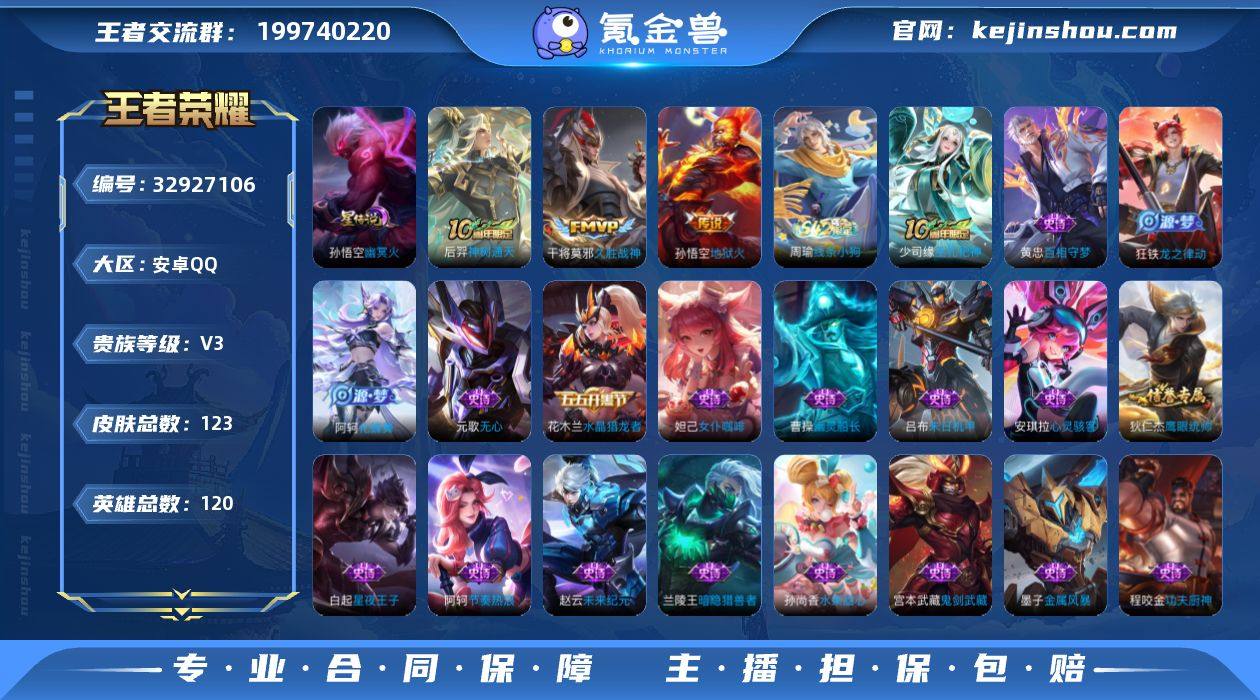 【WZ181973】安卓Q-V3-永恒钻石II段位-120英雄-123皮肤-3传说-23史诗【传说皮肤】:后羿神树通天,干将莫邪久胜战神,孙悟空地狱火【限定皮肤】:姜子牙天穹之誓,狄仁杰阴阳师,高渐离玩趣恶龙,元歌无心,干将莫邪胡桃夹子,裴擒虎擒涛扼浪,鲁班大师探海日志,桑启海盐诗旅,张良古海寻踪,鬼谷子天穹祈灯,刘邦剑破天穹,刘备异域游侠【赛季限定】:桑启海盐诗旅,裴擒虎擒涛扼浪,鲁班大师探海日志,张良古海寻踪,鬼谷子天穹祈灯,刘邦剑破天穹,姜子牙天穹之誓,东皇太一噬灭天穹,太乙真人谧流熔炉,钟馗虚灵犬护【战令限定】:周瑜线条小狗【史诗皮肤】:周瑜线条小狗,少司缘巫礼祀神,黄忠百相守梦,狂铁龙之律动,阿轲化蝶舞,元歌无心,狄仁杰鹰眼统帅,阿轲节奏热浪,白起星夜王子,程咬金功夫厨神,安琪拉心灵骇客,雅典娜冰冠公主,兰陵王暗隐猎兽者,花木兰水晶猎龙者,吕布末日机甲,曹操幽灵船长,墨子金属风暴,妲己女仆咖啡,妲己魅力维加斯,嬴政摇滚巨星,孙尚香水果甜心,宫本武藏鬼剑武藏,王昭君偶像歌手,赵云未来纪元【其他皮肤】:鲁班七号班班快跑,虞姬溯影追猎,艾琳鹤鸣心笺,莱西奥踏浪烽翎,云中君云械蓝图,白起死霸装,姬小满小满鸭,露...
