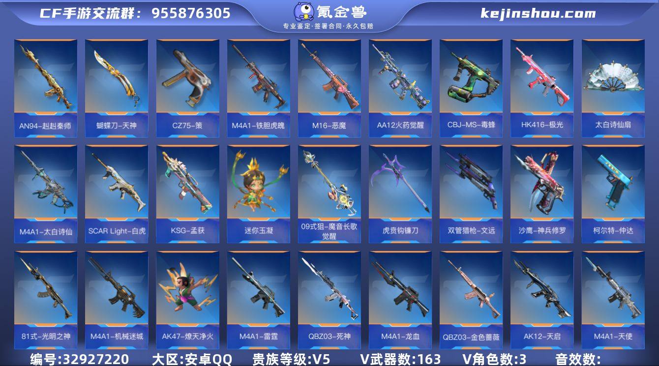 3英雄角色数-160英雄武器数 【王者系列】:王者之影,王者之心,王者之魂,王者之霆,王者之誉 【热门武器】:KSG-孟获,81式-光明之神,CZS2-仲康,AN94-盖 【角色】:关小雨,炽天使-X,零-新生 【英雄武器】:AK47-无影,AK47-火麒麟,AK47-黑武士觉醒,AK47-燎天净火,AK47-谜城烟火*2,M4A1-雷神,M4A1-黑骑士,M4A1-死神,M4A1-天使,M4A1-龙血,M4A1-机械迷城,M4A1-雷霆,M4A1-猎神,M4A1-夏清,M4A1-太白诗仙,M4A1-铁胆虎魄,M4A1-青龙,SCAR Light-白虎,SCAR-心动PICK,AN94-四凶觉醒,AN94-赳赳秦师,AN94-盖,M14EBR-葫芦山庄,M16-恶魔,AK12-天启,QBZ03-金色蔷薇*2,QBZ03-死神,HK416-极光,HK417-炎龙铠甲,81式-光明之神,G3A3-衍神兵,QBZ97-浩瀚征途,QBZ191-封神榜,QBZ191-帝皇铠甲,AWM-天龙,AWM-裁决,AWM-指南针,AWM-大湾溢彩,巴雷特-毁灭*2,巴雷特-极光,09式狙-天神,09式狙-魔音长歌觉醒,98K-星神,MR1-龙吟惊沧海,MR1-幽暗骑士,QBB95-极光,MK5-极光,QCW05-变形金刚·大黄蜂,CBJ-MS-毒蜂,CZS2-仲康,M12S-天公,DDM4-PDW-星际宇航觉醒,打击者-天神,嗜血金鲨,地狱烈炎,AA12-火药觉醒,KSG-黑骑士,KSG-火力竞放觉醒,KSG-孟获,US...