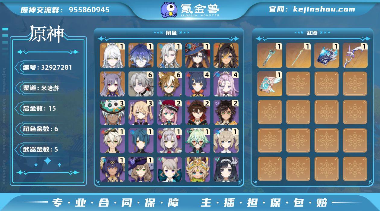 15黄!1命菲林斯!1+1兹白!1+1龙王!冒险等级: 55 1命金色角色: 一命莫娜,一命那维莱特,一命菲林斯,一命兹白 0命金色角色: 刻晴,迪希雅 拥有武器: 天空之卷,阿莫斯之弓,万世流涌大典,朏魄含光,狼的武功歌 1精武器: 天空之卷,阿莫斯之弓,万世流涌大典,朏魄含光,狼的武功歌