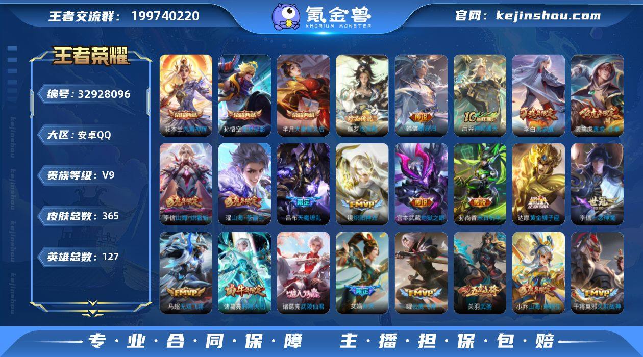 安卓Q-V9-最强王者段位-127英雄-365皮肤-3典藏皮肤-1珍品传说-28传说-111史诗 【英雄全皮】:狂铁全皮,猪八戒全皮,敖隐全皮 【荣耀典藏】:孙悟空全息碎影,芈月大秦宣太后,花木兰九霄神辉 【珍品传说】:伽罗沧流箭 【传说皮肤】:韩信踏浪归,后羿神树通天,孙悟空齐天大圣,小乔山海琳琅生,曜山海苍雷引,李信山海炽霜斩,吕布怒海麟威,马超无双飞将,女娲补天,裴擒虎寅虎赤拳,诸葛亮时雨天司,镜炽阳神光,虞姬启明星使,孙悟空零号赤焰,关羽武圣,曜云鹰飞将,李信一念神魔,张良黄金白羊座,干将莫邪久胜战神,达摩黄金狮子座,后羿黄金射手座,诸葛亮武陵仙君,李白凤求凰,孙尚香末日机甲,宫本武藏地狱之眼,孙悟空地狱火,吕布天魔缭乱,狄仁杰超时空战士 【限定皮肤】:姜子牙天穹之誓,杨戬破阵退雄兵,狄仁杰阴阳师,小乔山海琳琅生,赵云皇家上将,赵云龙胆,墨子神迹守卫,嬴政白昼王子,鲁班七号狮舞东方,庄周高山流水,高渐离死亡摇滚,高渐离玩趣恶龙,白起夜都怪侠,芈月白晶晶,芈月幻夜卜梦,吕布天魔缭乱,吕布猎兽之王,周瑜赤莲之焰,元歌云间偶戏,元歌无心,夏侯惇朔风刀,甄姬女儿国国王,典韦穷奇,典韦蓝屏警告,马可波罗暗影游猎,马...