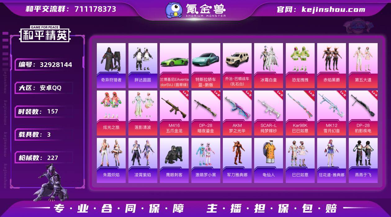 安卓 手Q-6粉装-7特效枪-3载具-76048热力值-11印记-157套装-227枪皮 【稀有载具】:特斯拉Roadster(水滴蓝),兰博基尼Aventador SVJ(翡翠绿),乔治巴顿战车(乳石白) 【特效枪等级】:AKM-梦之光华(五级),SCAR-L-纯梦嫁纱(五级),M416-五爪金龙(六级),Kar98K-巳巳如意(五级),MK12-雪月幻音(五级),DP-28-暗夜鎏金(六级),DP-28-豹影疾电(四级) 【优质套装】:粉装-冰霜白皇,粉装-恐龙拽拽,粉装-赤焰黑爵,粉装-第五大道,粉装-炫光之旅,粉装-莲影清波 【稀有套装】:套装-龟仙人,套装-巳巳如意,角色-狂花道·雅典娜,套装-燕燕于飞,套装-鱼渊荷华,角色-绛羽幽主,套装-朱霞炽焰,套装-凌霄紫焰 【优质武器皮肤】:AKM-梦之光华,SCAR-L-纯梦嫁纱,M416-五爪金龙,Kar98K-巳巳如意,MK12-雪月幻音,DP-28-暗夜鎏金,DP-28-豹影疾电 【稀有武器皮肤】:AKM-2P战斗服款,AKM-四圣焕新,AKM-夜灯,AKM-彩虹符号,AKM-影袭,AKM-江南烟雨,AKM-破晓战魂,AKM-龙的传人,M16A4-幻世战舞者,M16A4-甜心亚梦,SCAR-L-凝视深渊,SCAR-L-炫彩节奏,SCAR-L-玉兔迎春,SCAR-L-粉锦千层,SCAR-L-红色方程式,M416-糯团青竹,M416-红色方程式,M416-蓝色火焰,GROZA-异彩先驱...