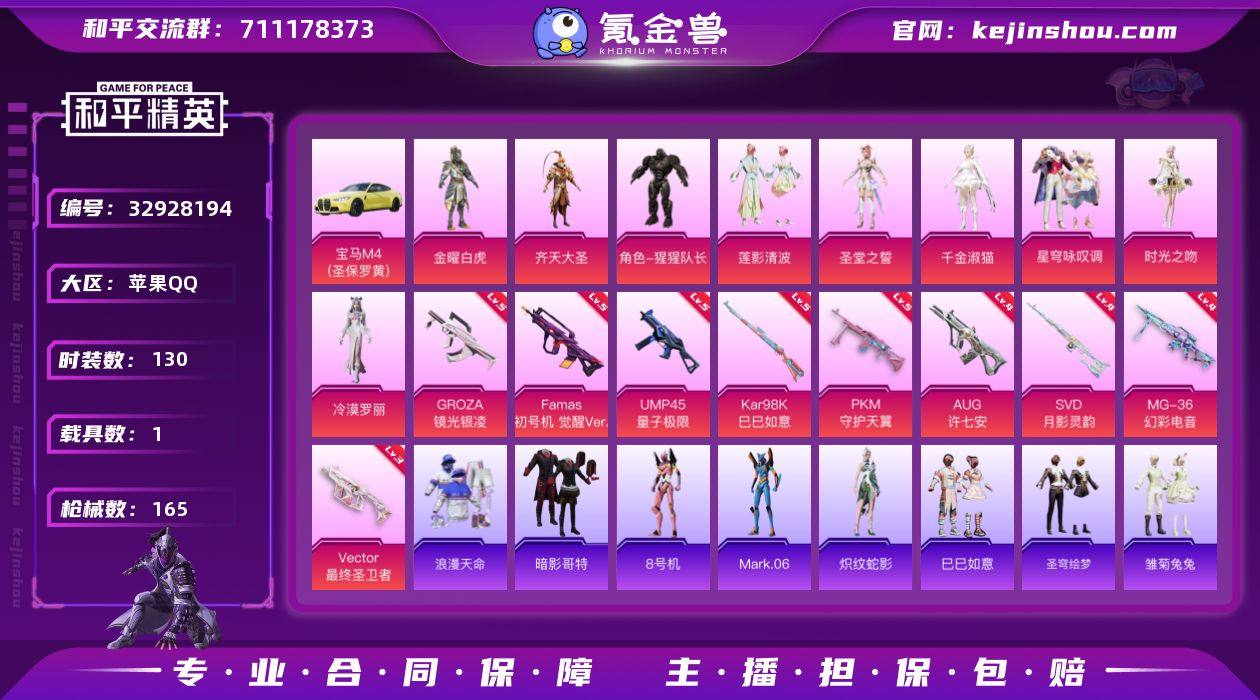 苹果 手Q-9粉装-9特效枪-1载具-2粉色飞行器-57473热力值-8王牌印记-130套装-165枪皮 【热门品类】:套装-浪漫天命,套装-暗影哥特,角色-8号机,角色-Mark.06 【粉色载具】:宝马M4(圣保罗黄) 【粉色套装】:粉装-金曜白虎,粉装-齐天大圣,角色-猩猩队长,粉装-莲影清波,角色-圣堂之誓,角色-千金淑猫,粉装-星穹咏叹调,角色-时光之吻,角色-冷漠罗丽 【粉色枪皮等级】:GROZA-镜光银凌(五级),AUG-许七安(四级),Famas-初号机 觉醒Ver.(五级),UMP45-量子极限(五级),Vector-最终圣卫者(三级),Kar98K-巳巳如意(五级),SVD-月影灵韵(四级),PKM-守护天翼(五级),MG-36-幻彩电音(四级) 【粉色枪皮】:GROZA-镜光银凌,AUG-许七安,Famas-初号机 觉醒Ver.,UMP45-量子极限,Vector-最终圣卫者,Kar98K-巳巳如意,SVD-月影灵韵,PKM-守护天翼,MG-36-幻彩电音 【粉色飞行器】:拂晓神骑飞行器,镜域双华-灵镜之阶 【粉色降落伞】:快乐主宰降落伞,至尊龙雀降落伞,四圣焕新降落伞,齐天大圣降落伞,未来歌姬降落伞,拂晓神骑降落伞,炫光之旅降落伞,繁龙极客降落伞,精灵梦叶罗丽降落伞,创世·救赎降落伞,星梦奇缘降落伞,初号机 觉醒Ver.降落伞,拳皇·狂花道降落伞,未...