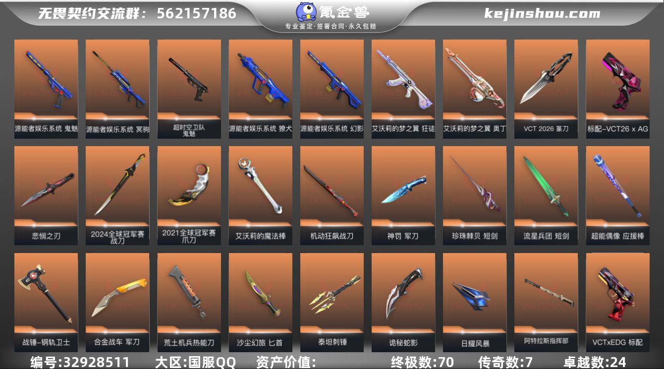 【946295】【17.5w库存离火刃.21冠军套.23冠军AK.24冠军套.怜悯之刃.VCT26纂刀.仙女棒.黑波之刃.掠夺蝴蝶刀.落英飞旋.十六狂徒十幻影YXy6434【无二次】【因赛季更新游戏段付以上号为准!】 【套装】:离火刃套装,2024全球冠军赛套装,2021全球冠军赛套装,源能者娱乐系统套装,VCT 2026 赛季套装,无畏契约季前邀请赛套装,混沌序曲套装,离火刃套装,光明哨兵//2.0套装,光明哨兵套装,全息波普//2.0套装,VCTxEDG 队伍套装,回火礼包:掠影套装,掠影//3.0套装,天界神兵//2.0套装,耀鳞威龙套装,无畏启程套装 【英雄】:幻棱,炼狱,维斯,暮蝶,钛狐,壹决,铁臂,捷风,雷兹,幽影,不死鸟,贤者,猎枭,蝰蛇,零,芮娜,奇乐,尚勃勒,霓虹,斯凯,夜露,星礈,K/O,海神,盖可,黑梦,钢锁 【近战武器】:近战武器-2024全球冠军赛 战刀,近战武器-2021全球冠军赛 爪刀,近战武器-VCT 2026 篆刀,近战武器-影蝶,近战武器-无畏契约季前邀请赛 悲悯之刃,近战武器-剥皮小刀,近战武器-紫金爪刀,近战武器-离火刃,近战武器-黑波之刃,近战武器-落英飞旋,近战武器-艾沃莉的魔法棒,近战武器-威龙之刃,近战武器-鬼丸国纲,近战武器-珍珠棘贝 短剑,近战武器-混沌大剑,...
