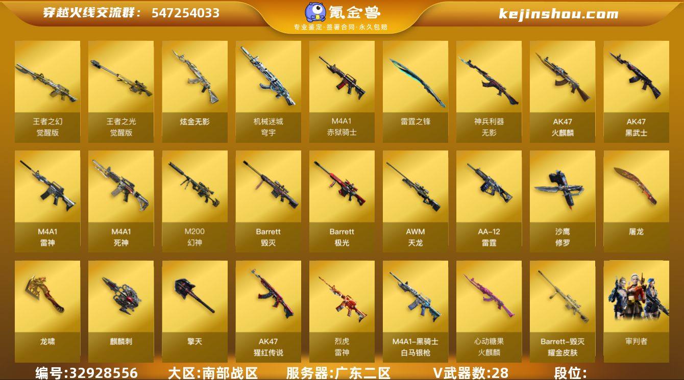 南部战区(广东二区)ys【爆破号】28v【M200-幻神,AK47-火麒麟,M4A1-雷神,M4A1-死神,AK47-黑武士,AWM-天龙,Barrett-毁灭,Barrett-极光,AA-12-雷霆】2王者【王者之幻,王者之光】1炫金【炫金无影】2角色【葵,审判者】7皮【雷神-烈虎,火麒麟-心动糖果,毁灭-墨兰,火麒麟-AG战队,天龙-CF STAR】截图展示段位不代表实际段位 如赛季更新等不可抗拒因素发生变化、时限道具不保证所剩时间