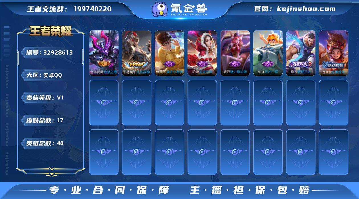 实名: 可修改 贵族等级: V1 英雄数: 48 皮肤数: 17 传说皮: 久胜战神,地狱之眼