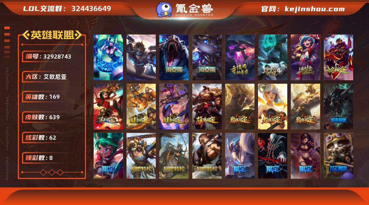 实名: 可修改 英雄数: 169 皮肤数: 639 炫彩数: 62 海克斯: 海克斯 雷克顿,海克斯 波比 限定: 钢铁军团 拉克丝 情人节限定: 觅心萝莉 金克丝,碎心之拳 蔚,甜心宝贝 娑娜 赛季限定皮: 斗牛士 阿利斯塔,胜利之树 茂凯,胜利枪神 格雷福斯,胜利女神 奥莉安娜,胜利之剑 亚托克斯 冠军限定系列: S1FNC 酒桶,S1FNC 嘉文四世,S2 暗杀星 蒙多,S2 暗杀星 努努,S2 暗杀星 慎,S2 暗杀星 伊泽瑞尔,S3 SKT T1 劫,S3 SKT T1 婕拉,S4 SSW 锤石,S4 SSW 雷恩加尔,S4 SSW 图奇,S4 SSW 炼金,S5 SKT T1 雷克顿,S5 SKT T1 阿利斯塔,S5 SKT T1 瑞兹,S5 SKT T1 蜘蛛,S5 SKT T1 滑板鞋,S6 SKT T1 扎克 冰雪节限定: 冰雪节 格雷福斯,冰雪节 玛尔扎哈,平安夜女神 娑娜,魄罗骑士 瑟庄妮,圣诞开心鬼 提莫,圣诞精灵 崔丝塔娜,圣诞老人 布隆,圣诞糖果棒 厄运小姐,圣诞玩偶 波比,圣诞驯鹿 克格莫,邪恶圣诞老人 维迦,幸福女神 乐芙兰,雪默丁格,雪装 奈德丽 泳池派对: 泳池派对 格雷福斯,泳池派对 雷克顿,泳池派对 塔里克,泳池派对 德莱文,泳池派对 扎克,泳池派对 吉格斯 万圣节限定: 鬼影森森 茂凯,鬼影重重 魔腾,海贼 瑞兹,灵魂收割者 索拉卡,南瓜头 费德提克,无头骑士 赫卡里姆 年限: 张辽 文远,神龙之翼 库奇...