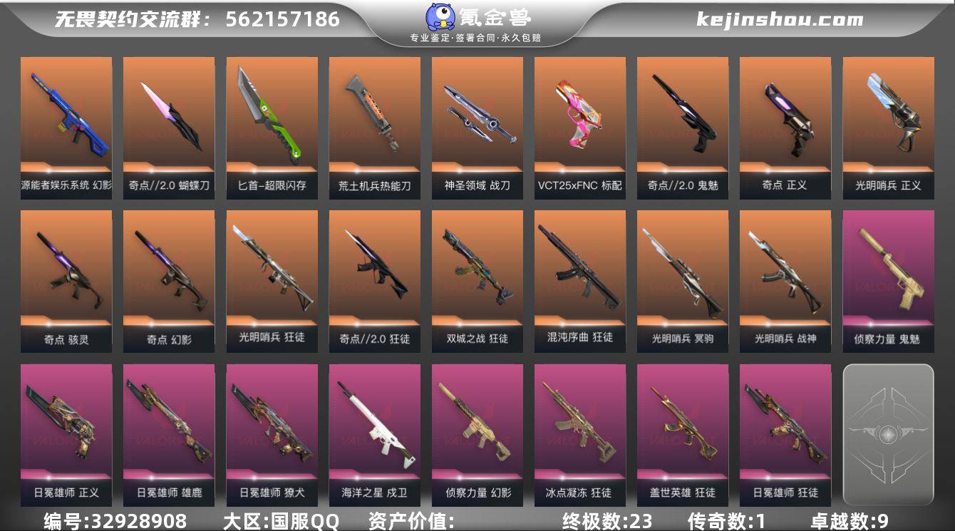 【套装】:荆刺圣骸套装,光明哨兵套装,奇点//2.0套装,回火礼包:奇点套装,日冕雄师套装 【英雄】:幻棱,炼狱,维斯,暮蝶,钛狐,壹决,铁臂,捷风,雷兹,幽影,不死鸟,贤者,猎枭,蝰蛇,零,芮娜,奇乐,尚勃勒,霓虹,斯凯,夜露,星礈,K/O,海神,盖可,黑梦,钢锁 【近战武器】:近战武器-荆刺链刃,近战武器-奇点//2.0 蝴蝶刀,近战武器-埃芒迪尔大剑,近战武器-超限闪存 匕首,近战武器-荒土机兵 热能刀,近战武器-圣石遗物,近战武器-神圣领域 战刀 【狂徒】:狂徒-光明哨兵,狂徒-混沌序曲,狂徒-奇点//2.0,狂徒-双城之战,狂徒-荆刺圣骸,狂徒-冰点凝冻,狂徒-盖世英雄,狂徒-日冕雄师,狂徒-超能偶像,狂徒-荒土机兵 【幻影】:幻影-奇点,幻影-源能者娱乐系统,幻影-侦察力量,幻影-超限闪存,幻影-神圣领域,幻影-纳米打击 【戍卫】:戍卫-荆刺圣骸,戍卫-海洋之星,戍卫-超能偶像,戍卫-浮光跃金,戍卫-逆冲蛮牛,戍卫-战术熊与伙伴们,戍卫-月球哨兵 【獠犬】:獠犬-日冕雄师,獠犬-神圣领域,獠犬-采蜜小蜂队,獠犬-模拟赫兹,獠犬-逆冲蛮牛 【冥驹】:冥驹-光明哨兵,冥驹-荒土机兵,冥驹-模拟赫兹,冥驹-星云暗涌 【飞将】:飞将-荆刺圣骸,飞将-...