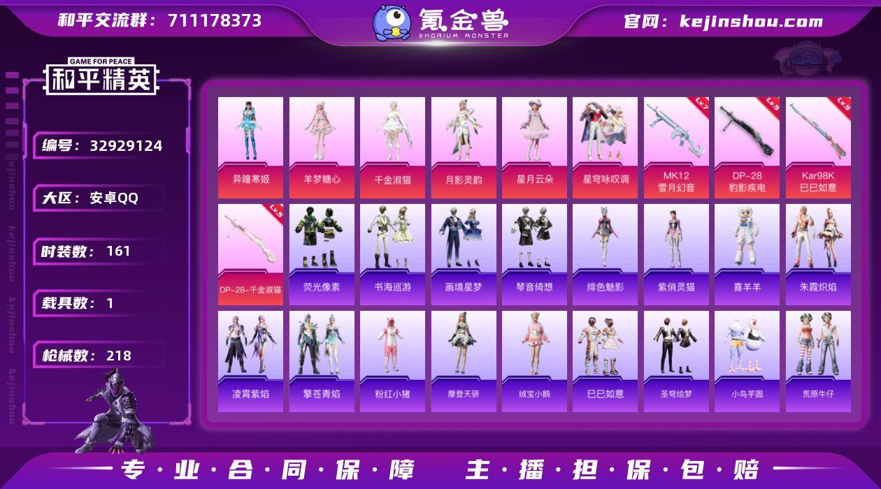安卓 手Q-6粉装-7特效枪-1载具-2粉色飞行器-65520热力值-8王牌印记-161套装-218枪皮 【热门品类】:套装-粉红小猪 【粉色套装】:角色-千金淑猫,角色-月影灵韵,粉装-星月云朵,粉装-星穹咏叹调,角色-羊梦糖心,角色-异瞳寒姬 【粉色枪皮等级】:ACE32-萌骑漫游(二级),AKS-74U-森灵之息(五级),Kar98K-巳巳如意(五级),Mk14-福马献瑞(五级),MK12-雪月幻音(七级),DP-28-千金淑猫(五级),DP-28-豹影疾电(五级) 【粉色载具】:暮色幽蹄 【粉色枪皮】:ACE32-萌骑漫游,AKS-74U-森灵之息,Kar98K-巳巳如意,Mk14-福马献瑞,MK12-雪月幻音,DP-28-千金淑猫,DP-28-豹影疾电 【粉色飞行器】:灵猫魔法师飞行器,暮色之舞飞行器 【粉色降落伞】:蜜语绒猫降落伞,时空协奏降落伞,千金淑猫降落伞,临安公主降落伞,樱桃泡泡降落伞,智耀战神降落伞,星穹咏叹调降落伞,绯穹魔姬降落伞,喜羊羊与灰太狼降落伞,异瞳寒姬降落伞,炫彩糖果降落伞,霁蓝缠春降落伞 【稀有套装】:套装-摩登天骄,套装-绒宝小鹅,套装-巳巳如意,套装-圣穹绘梦,套装-小鸟芋圆,套装-荒原牛仔,套装-云鹰凌岚,套装-荧光像素,套装-雪国风尚,套装-小财神当家,套装-马上来财,套装-雏菊兔兔,套装-萝...