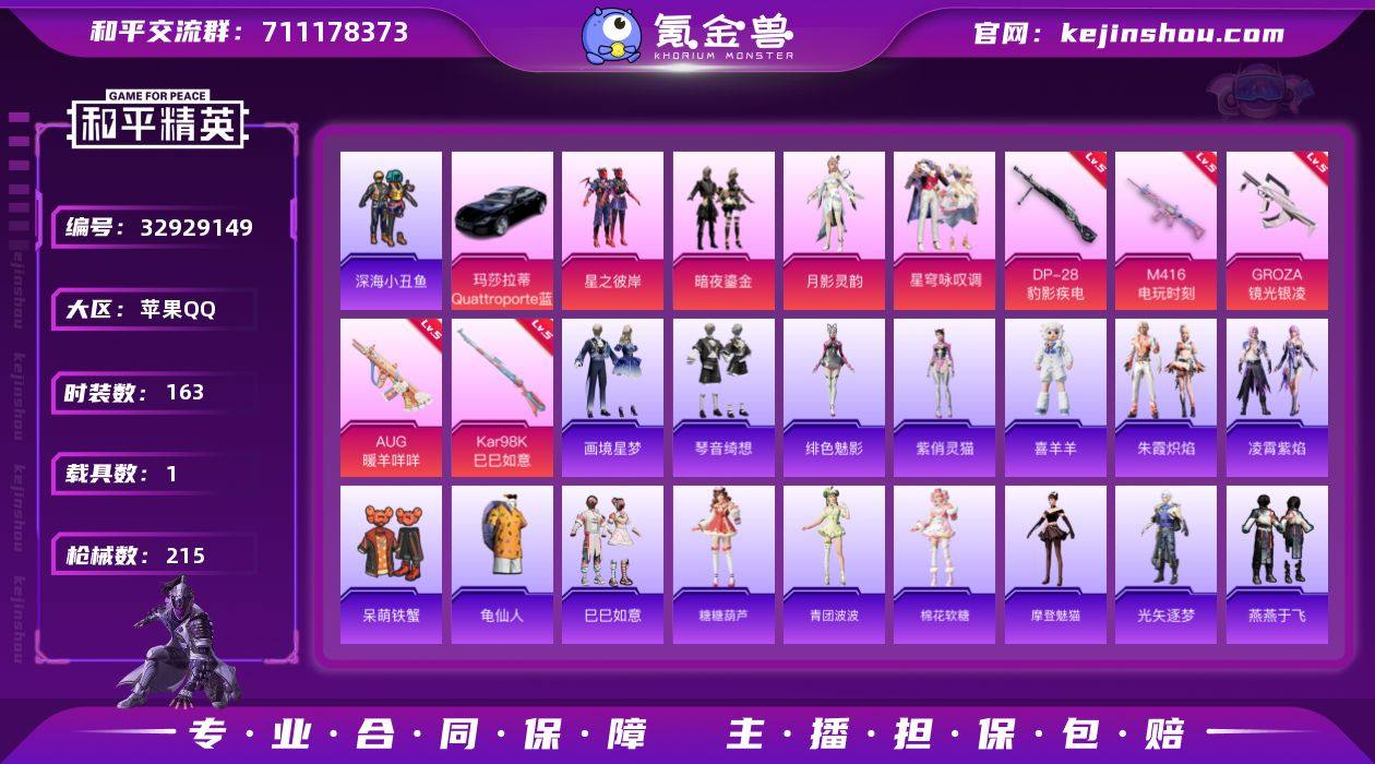 苹果 手Q-4粉装-5特效枪-1载具-1粉色飞行器-63269热力值-15王牌印记-163套装-215枪皮 【热门品类】:套装-深海小丑鱼,套装-龟仙人 【粉色套装】:粉装-星之彼岸,粉装-暗夜鎏金,角色-月影灵韵,粉装-星穹咏叹调 【粉色枪皮等级】:M416-电玩时刻(五级),GROZA-镜光银凌(五级),AUG-暖羊咩咩(五级),Kar98K-巳巳如意(五级),DP-28-豹影疾电(五级) 【粉色载具】:玛莎拉蒂Quattroporte(夜幕蓝) 【粉色枪皮】:M416-电玩时刻,GROZA-镜光银凌,AUG-暖羊咩咩,Kar98K-巳巳如意,DP-28-豹影疾电 【粉色飞行器】:炫彩糖果飞行器 【粉色降落伞】:垂柳戏鸭降落伞,暗夜鎏金降落伞,炫光之旅降落伞,莲影清波降落伞,喜羊羊与灰太狼降落伞,异瞳寒姬降落伞,炫彩糖果降落伞,罪夜之冕降落伞 【稀有套装】:套装-龟仙人,套装-巳巳如意,套装-雪国风尚,套装-炫彩糖果,套装-糖糖葫芦,套装-青团波波,套装-棉花软糖,角色-摩登魅猫,角色-光矢逐梦,套装-燕燕于飞,套装-鱼渊荷华,套装-极速光影,套装-朱霞炽焰,套装-凌霄紫焰,玩偶服-喜羊羊,角色-绯色魅影,角色-紫俏灵猫,套装-画境星梦,套装-琴音绮想 【稀有枪皮】:AUG-冰晶雪宝,AKM-冰凉西瓜,AKM-彩虹符号,AKM-破晓...