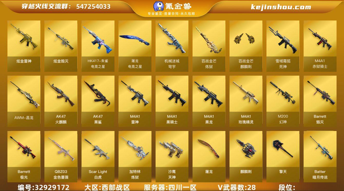 西部战区(四川一区)ys【爆破号】28v【M200-幻神+双皮/AG-CFPLS17冠军/黄忠,电竞之星套装,QBZ03-金色蔷薇,ScarLight-白虎,Colt1911-大黄蜂,猫猫手套,胡萝卜匕首】2王者【超新星-悦享,炼狱-悦蓝】2炫金【炫金雷神,炫金毁灭】5角色【零·纪元,战地猎狐,幻面灵狐,葵-阿尔法武装,雪域霜狐】7音效【沙鹰-修罗-盛典舞曲音效卡,Barrett碧霄极光音效卡,屠龙-电竞之星-竞星跃动音效卡,HK417-朱雀-电竞之星-竞星跃动音效卡,M4A1-黑骑士音效卡,炼狱-百战金芒-庆典舞曲音效卡,死神-雪域霜狐-怀旧音效卡】26皮【幻神-AG-CFPLS17冠军,幻神-黄忠,雷神-机甲刑天,毁灭-巅峰荣耀,雷神-宇航兔,火麒麟-雷神,屠龙-巅峰荣耀,黑骑士-战神马超,毁灭-虹光风暴,裁决-百城联赛天津,火麒麟-CF STAR,天龙-CF STAR,毁灭-英雄计划,黑骑士-AG-S4冠军典藏,毁灭-黑大圣】挑战枪【暴君乱世-超越6】【VIP3】 截图展示段位不代表实际段位 如赛季更新等不可抗拒因素发生变化、时限道具不保证所剩时间