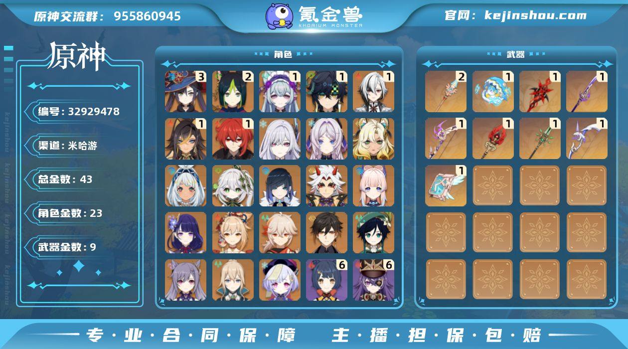 邮箱: 未绑定 总黄数: 43 冒险等级: 59 3命金色角色: 三命莫娜 2命金色角色: 二命提纳里 1命金色角色: 一命迪卢克,一命迪希雅,一命阿蕾奇诺,一命基尼奇,一命梦见月瑞希 0命金色角色: 温迪,枫原万叶,宵宫,七七,刻晴,钟离,琴,雷电将军,珊瑚宫心海,荒泷一斗,夜兰,纳西妲,玛拉妮,希诺宁,茜特菈莉,丝柯克 拥有武器: 飞雷之弦振,天空之卷,和璞鸢,阿莫斯之弓,天空之脊,护摩之杖,薙草之稻光,赤月之形,冲浪时光 2精武器: 天空之脊 1精武器: 飞雷之弦振,天空之卷,和璞鸢,阿莫斯之弓,护摩之杖,薙草之稻光,赤月之形,冲浪时光