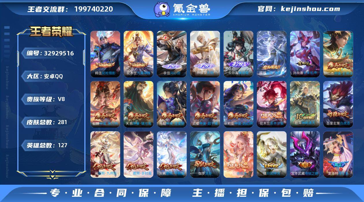 BHC30537,满马年*李信问心剑*公孙离离恨烟*1星元*17按键,安卓Q-V8-最强王者段位-127英雄-281皮肤-2典藏皮肤-3无双-1珍品传说-33传说-75史诗 【英雄全皮】:孙权全皮,敖隐全皮,戈娅全皮,空空儿全皮 【荣耀典藏】:花木兰九霄神辉,韩信弑枪猎影 【无双皮肤】:李信问心剑,孙悟空无相,公孙离离恨烟 【珍品传说】:嫦娥器灵落星盏 【传说皮肤】:云缨神骥越千峰,关羽神骥镇沧海,朵莉亚神骥鸣幻洲,狄仁杰神骥赴朔漠,貂蝉神骥聚万邦,马超神骥逐星野,花木兰异界灵契,后羿神树通天,西施续相思,女娲愿照千秋盛,澜愿照九州拓,虞姬愿照岁时盈,裴擒虎祥瑞亨通,桑启鸣野蒿,露娜霜月吟,云缨鹤归松栖,上官婉儿妄想奇谈,马可波罗妄想实况,东皇太一灼幽烈阳,夏洛特浮生妄,李白诗剑行,马超无双飞将,镜炽阳神光,虞姬启明星使,曜云鹰飞将,李信一念神魔,伽罗太华,张良黄金白羊座,虞姬云霓雀翎,达摩黄金狮子座,百里玄策白虎志,孙尚香末日机甲,宫本武藏地狱之眼 【限定皮肤】:公孙离离恨烟,姜子牙天穹之誓,狄仁杰阴阳师,赵云皇家上将,扁鹊奇幻香踪,吕布御风骁将,元歌无心,马可波罗妄想实况,狄仁杰魔术师,项羽海滩派对,李元芳云中旅人,虞姬启明星...