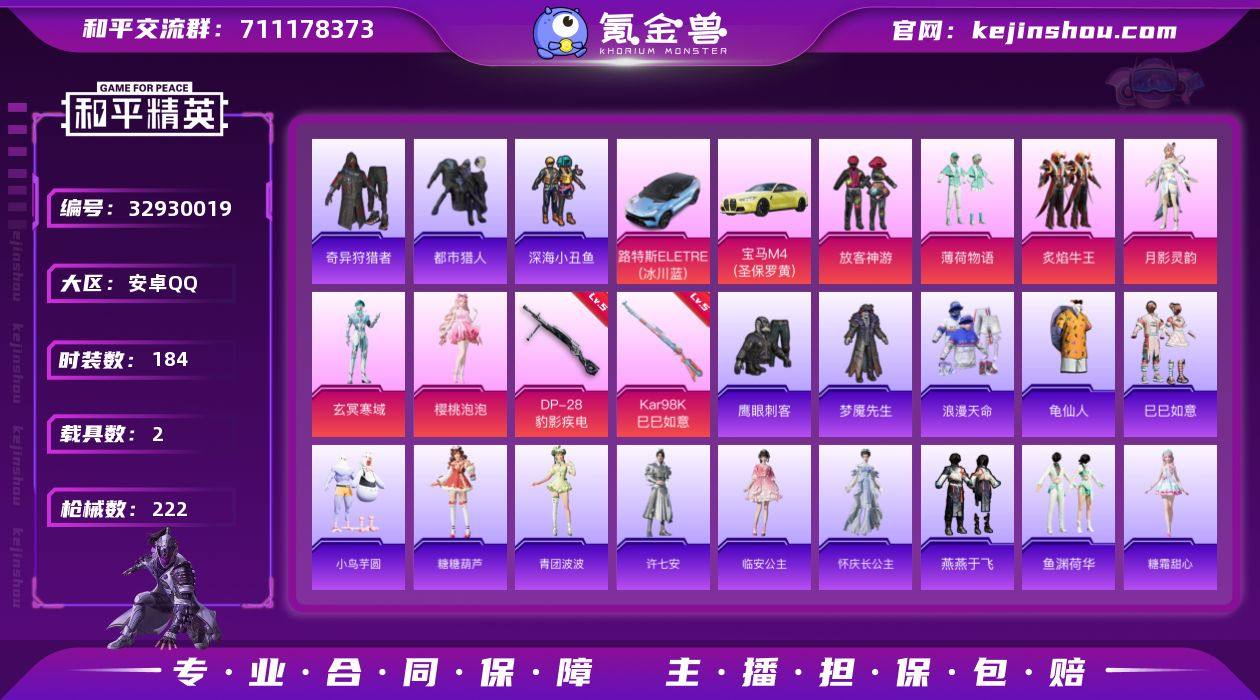 安卓 手Q-6粉装-4特效枪-2载具-1粉色飞行器-67935热力值-14王牌印记-184套装-222枪皮 【热门品类】:套装-浪漫天命,套装-都市猎人,套装-深海小丑鱼,套装-奇异狩猎者,套装-龟仙人 【粉色套装】:粉装-放客神游,粉装-薄荷物语,粉装-炙焰牛王,角色-月影灵韵,角色-玄冥寒域,角色-樱桃泡泡 【粉色枪皮等级】:AKS-74U-森灵之息(五级),Kar98K-巳巳如意(五级),Mk14-福马献瑞(五级),DP-28-豹影疾电(五级) 【粉色载具】:路特斯ELETRE(冰川蓝),宝马M4(圣保罗黄) 【粉色枪皮】:AKS-74U-森灵之息,Kar98K-巳巳如意,Mk14-福马献瑞,DP-28-豹影疾电 【粉色飞行器】:极意拳锋飞行器 【粉色降落伞】:幻影战神降落伞,银刃赛罗降落伞,香水柠檬降落伞,恐龙拽拽降落伞,垂柳戏鸭降落伞,临安公主降落伞,盛世惊鸿降落伞,幻星舰长降落伞,炫彩糖果降落伞,虎痴许褚降落伞 【稀有套装】:套装-龟仙人,套装-巳巳如意,套装-小鸟芋圆,套装-雪国风尚,套装-马上来财,套装-糖糖葫芦,套装-青团波波,角色-许七安,角色-临安公主,角色-怀庆长公主,套装-燕燕于飞,套装-鱼渊荷华,角色-糖霜甜心,套装-星渊小夜曲,套装-虚空漩涡,套装-霓虹热舞,套装-彩虹兔,套装-云朵鹅...