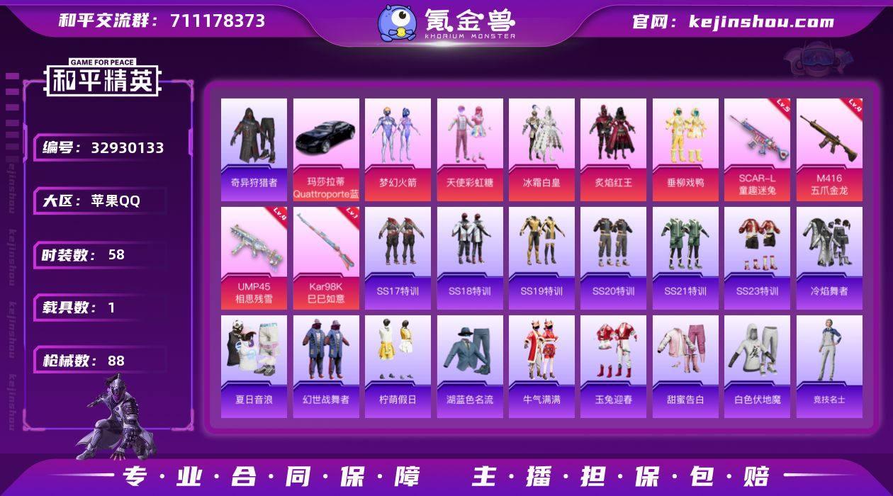 苹果 手Q-5粉装-5特效枪-1载具-0粉色飞行器-28651热力值-4王牌印记-58套装-88枪皮 【热门品类】:粉装-梦幻火箭,套装-奇异狩猎者 【粉色套装】:粉装-天使彩虹糖,粉装-梦幻火箭,粉装-冰霜白皇,粉装-炙焰红王,粉装-垂柳戏鸭 【粉色枪皮等级】:SCAR-L-童趣迷兔(五级),M416-五爪金龙(四级),UMP45-相思残雪(四级),Kar98K-巳巳如意(一级),Mk14-福马献瑞(一级) 【粉色载具】:玛莎拉蒂Quattroporte(夜幕蓝) 【粉色枪皮】:SCAR-L-童趣迷兔,M416-五爪金龙,UMP45-相思残雪,Kar98K-巳巳如意,Mk14-福马献瑞 【粉色降落伞】:梦幻火箭降落伞,相思残雪降落伞,碧影闪光降落伞,环太平洋降落伞,垂柳戏鸭降落伞,太空嘟嘟降落伞 【稀有枪皮】:AKM-破晓战魂,AKM-虎虎生威,AKM-霓虹街区,AKM-龙的传人,M16A4-甜心亚梦,SCAR-L-炫彩节奏,SCAR-L-玉兔迎春,SCAR-L-红色方程式,M416-圣诞惊喜,M416-糯团青竹,M416-红色方程式,M416-蓝色火焰,GROZA-异彩先驱,AUG-幻影战神,AUG-耀粉歌者,QBZ-洛神天依,QBZ-飞驰魅影,M762-天降萌叽,M762-枪炮玫瑰,M762-瑞龙福将,AC-VAL-天降萌叽,AC-VAL-彩虹甜喵,AC-VAL-甜心亚梦,蜜獾-娇憨猪猪,UZI-娇憨猪猪,UZI-红色方程式...