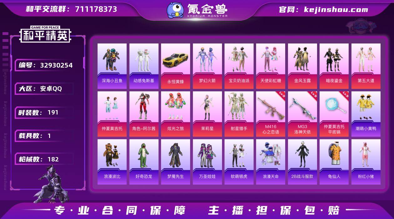 安卓 手Q-11粉装-4特效枪-1载具-1粉色飞行器-62270热力值-4王牌印记-191套装-182枪皮 【热门品类】:粉装-梦幻火箭,套装-浪漫天命,套装-深海小丑鱼,套装-动感兔斯基人偶服,角色-2B战斗服款,套装-龟仙人,套装-潮萌小黄鸭,套装-浪漫波比,套装-粉红小猪 【粉色套装】:粉装-宝贝奶油派,粉装-天使彩虹糖,粉装-梦幻火箭,粉装-金风玉露,粉装-暗夜鎏金,粉装-第五大道,粉装-仲夏莫吉托,角色-阿尔茜,粉装-炫光之旅,角色-茉莉星,粉装-射星猎手 【粉色枪皮等级】:M416-心之恋语(五级),Mk14-福马献瑞(一级),MG3-洛神天依(五级),平底锅-仲夏莫吉托(五级) 【粉色载具】:永恒黄蜂,僚机-炫光之旅 【粉色枪皮】:M416-心之恋语,Mk14-福马献瑞,MG3-洛神天依,平底锅-仲夏莫吉托 【粉色飞行器】:神秘黑猫飞行器 【粉色降落伞】:甜心宝贝降落伞,神秘黑猫降落伞,扶摇飞仙降落伞,洛神天依降落伞,彩虹甜喵降落伞,暗夜鎏金降落伞,第五大道降落伞,仲夏莫吉托降落伞,闲梦青缨降落伞,超新星降落伞,罪夜之冕降落伞 【稀有套装】:套装-龟仙人,套装-马上来财 【稀有枪皮】:AKM-冰凉西瓜,AKM-四圣焕新,AKM-夜灯,AKM-灼热熔岩,AKM-破晓战魂,AKM-霓虹街区,AKM-...