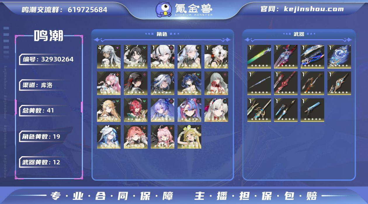 男/女主: 男主 总黄数: 41 联觉等级: 80 拥有五星共鸣者: 鉴心,卡卡罗,安可,维里奈,凌阳,今汐,长离,守岸人,椿,珂莱塔,洛可可,坎特蕾拉,夏空,卡提希娅,弗洛洛,尤诺,嘉贝莉娜,千咲,爱弥斯 4鸣五星共鸣者: 4鸣卡卡罗 3鸣五星共鸣者: 3鸣鉴心 1鸣五星共鸣者: 1鸣凌阳,1鸣今汐,1鸣椿 0鸣五星共鸣者: 0鸣安可,0鸣维里奈,0鸣长离,0鸣守岸人,0鸣珂莱塔,0鸣洛可可,0鸣坎特蕾拉,0鸣夏空,0鸣卡提希娅,0鸣弗洛洛,0鸣尤诺,0鸣嘉贝莉娜,0鸣千咲,0鸣爱弥斯 拥有五星武器: 千古洑流,停驻之烟,时和岁稔,赫奕流明,裁春,血誓盟约,不屈命定之冠,万物持存的注释,光影双生,昙切,镭射切变 1鸣五星武器: 1鸣千古洑流,1鸣停驻之烟,1鸣时和岁稔,1鸣赫奕流明,1鸣裁春,1鸣血誓盟约,1鸣不屈命定之冠,1鸣万物持存的注释,1鸣光影双生,1鸣昙切,1鸣镭射切变 亮点: 80级/41黄/男主/19个五星角色/12个五星武器未绑定,爱弥斯,千咲,嘉贝莉娜,尤诺,弗洛洛,卡提希娅,夏空,坎特蕾拉,珂莱塔,洛可可,椿,守岸人,长离,今汐,维里奈,鉴心,卡卡罗,安可,凌阳,镭射切变,昙切,光影双生,万物持存的注释,不屈命定之冠,血誓盟约,裁春,赫奕流明,时和岁稔,千古洑流,停驻之烟,4命卡卡罗,3命鉴心,1命椿,1命今汐,1命凌阳,0命爱弥斯,0命千...