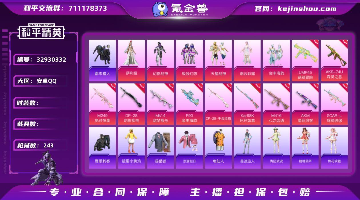 实名: 不可修改 枪械数: 243 热门装扮: 幻影战神,鹰眼刺客,都市猎人,极致幻想,天星战神,烟云彩露,金丰海韵,萨利娅 稀有枪皮: M416心之恋语,AKM星际浪客,SCAR-L-锦绣绵绵,P90-金丰海韵,DP-28-千金淑猫,Kar98K-巳巳如意,MK14-甜梦熊击,DP-28-豹影疾电,M249-绝对恒星,AKS-74U-森灵之息,UMP45-萌骑冒险