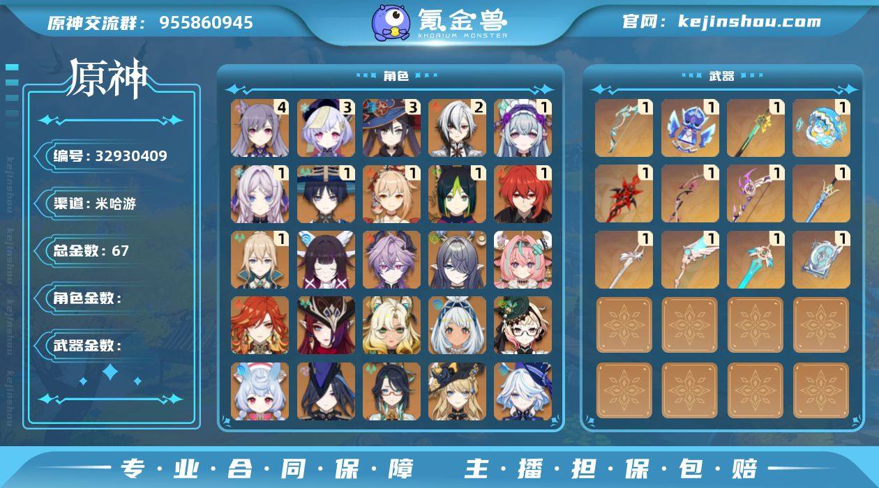 【原神】冒险等级:60,五星数量:48,五星角色:刻晴 * 4命,莫娜 * 3命,七七 * 3命,阿蕾奇诺 * 2命,茜特菈莉 * 1命,梦见月瑞希 * 1命,迪卢克 * 1命,琴 * 1命,宵宫 * 1命,提纳里 * 1命,流浪者 * 1命,艾梅莉埃,玛拉妮,希诺宁,神里绫华,温迪,恰斯卡,玛薇卡,迪希雅,钟离,瓦雷莎,那维莱特,夜兰,芙宁娜,娜维娅,闲云,纳西妲,菈乌玛,杜林,哥伦比娅,枫原万叶,克洛琳德,希格雯,雷电将军__五星武器:冲浪时光,岩峰巡歌,祭星者之望,最初的大魔术,赤月之形,黎明破晓之史,苍古自由之誓,飞雷之弦振,风鹰剑,四风原典,天空之刃,天空之翼__四星角色:班尼特 * 6命,行秋 * 6命,九条裟罗 * 6命,香菱 * 6命,久岐忍 * 6命,鹿野院平藏 * 6命,珐露珊 * 6命,凝光 * 6命,迪奥娜 * 6命,砂糖 * 6命,绮良良 * 6命,坎蒂丝 * 6命,柯莱 * 6命,芭芭拉 * 6命,云堇 * 6命,早柚 * 6命,托马 * 6命,五郎 * 6命,重云 * 6命,诺艾尔 * 6命,罗莎莉亚 * 6命,雷泽 * 6命,菲谢尔 * 6命,北斗 * 6命,赛索斯 * 6命,卡维 * 5命,辛焱 * 5命,夏沃蕾 * 5命,卡齐娜 * 4命,莱依拉 * 4命,多莉 * 4命,菲米尼 * 4命,琳妮特 * 4命,蓝砚 * 3命,瑶瑶 * 2命,欧洛伦 * 2命,嘉明 * 2命,伊法 * 2命,米卡 * 1命,烟绯 * 1命,爱诺 * 1命,奇偶·女性,奇...