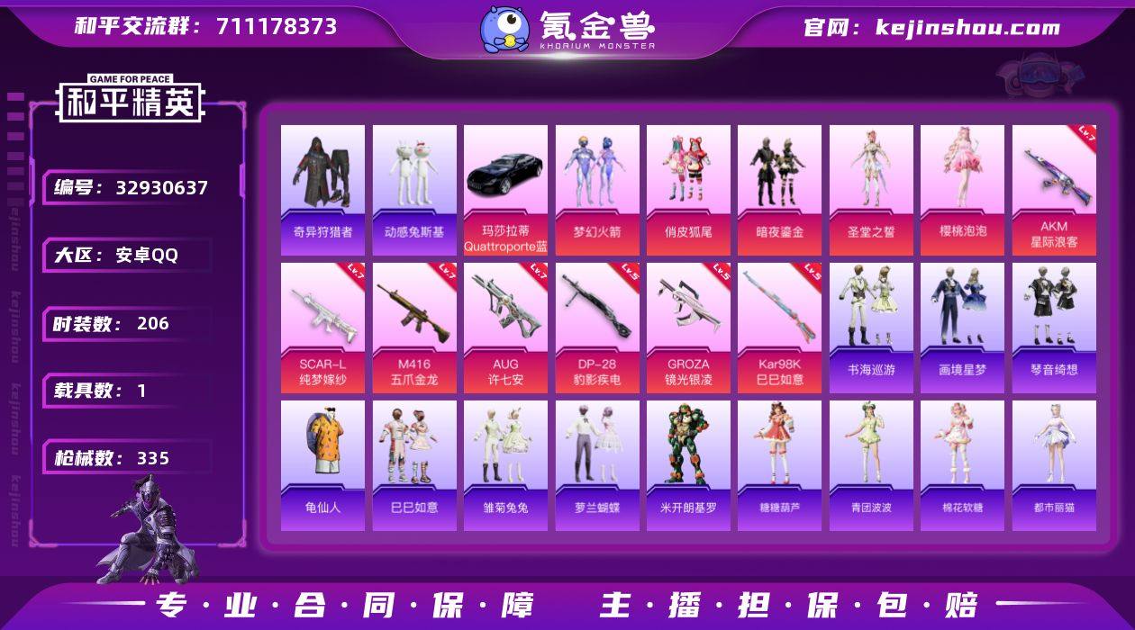 安卓 手Q-6粉装-10特效枪-1载具-4粉色飞行器-107852热力值-21王牌印记-206套装-335枪皮 【热门品类】:粉装-梦幻火箭,套装-奇异狩猎者,套装-动感兔斯基人偶服,套装-龟仙人 【粉色套装】:粉装-梦幻火箭,粉装-俏皮狐尾,粉装-暗夜鎏金,角色-圣堂之誓,角色-樱桃泡泡,角色-辉云木星 【粉色枪皮等级】:AKM-星际浪客(七级),SCAR-L-纯梦嫁纱(七级),M416-五爪金龙(七级),GROZA-镜光银凌(五级),AUG-许七安(七级),Kar98K-巳巳如意(五级),Mk14-辉云木星(六级),Mk14-福马献瑞(五级),AA12-G-萌骑幻想(一级),DP-28-豹影疾电(五级) 【粉色载具】:玛莎拉蒂Quattroporte(夜幕蓝) 【粉色枪皮】:AKM-星际浪客,SCAR-L-纯梦嫁纱,M416-五爪金龙,GROZA-镜光银凌,AUG-许七安,Kar98K-巳巳如意,Mk14-辉云木星,Mk14-福马献瑞,AA12-G-萌骑幻想,DP-28-豹影疾电 【粉色飞行器】:四圣焕新飞行器,齐天大圣飞行器,繁龙极客飞行器,彩虹独角兽飞行器 【粉色降落伞】:百万伏特降落伞,梦幻火箭降落伞,古堡领主降落伞,夏日绵绵冰降落伞,星之彼岸降落伞,暗夜玫瑰降落伞,恐龙拽拽降落伞,音爆索尼克降落伞,闲梦青缨降落伞,圣堂之誓降落伞,江南烟雨降落伞,精灵梦叶罗丽降...