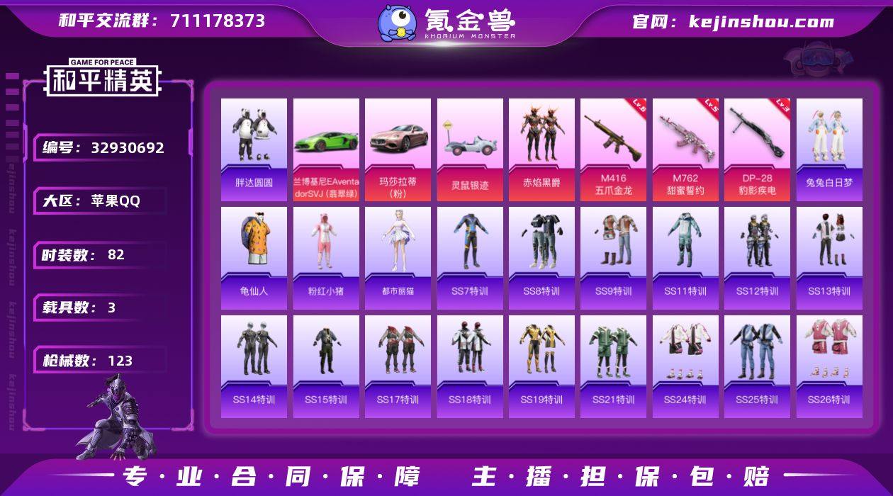 TD2633110可二次苹果 手Q-无敌战神框-1粉装-3特效枪-3载具-0粉色飞行器-39723热力值-21王牌印记-82套装-123枪皮 【热门品类】:套装-胖达圆圆,套装-龟仙人,套装-粉红小猪 【粉色套装】:粉装-赤焰黑爵 【粉色枪皮等级】:M416-五爪金龙(六级),M762-甜蜜誓约(五级),DP-28-豹影疾电(三级) 【粉色载具】:兰博基尼Aventador SVJ(翡翠绿),玛莎拉蒂Ghibli(粉),灵鼠银迹 【粉色枪皮】:M416-五爪金龙,M762-甜蜜誓约,DP-28-豹影疾电 【粉色降落伞】:四圣焕新降落伞,暗夜玫瑰降落伞,橘柚倾心降落伞,冷魅冰骑降落伞,精灵梦叶罗丽降落伞,月影灵韵降落伞 【稀有套装】:套装-龟仙人,角色-都市丽猫 【稀有枪皮】:AKM-四圣焕新,AKM-彩虹符号,AKM-影袭,AKM-灼热熔岩,AKM-破晓战魂,AKM-龙的传人,M16A4-幻世战舞者,M16A4-红色方程式,M16A4-蓝色火焰,SCAR-L-甜蜜誓约,SCAR-L-红色方程式,M416-糯团青竹,M416-红色方程式,M416-绯红前夜,M416-蓝色火焰,GROZA-恐龙拽拽,GROZA-懵萌河马,AUG-耀粉歌者,QBZ-原初圣火,QBZ-彩虹符号,QBZ-飞驰魅影,M762-天降萌叽,M762-橘柚倾心,M762-牛气冲天,M762-瑞龙福将,Mk47-洛神天依,G36C-懵萌河马,AC-VAL-闲梦青缨...