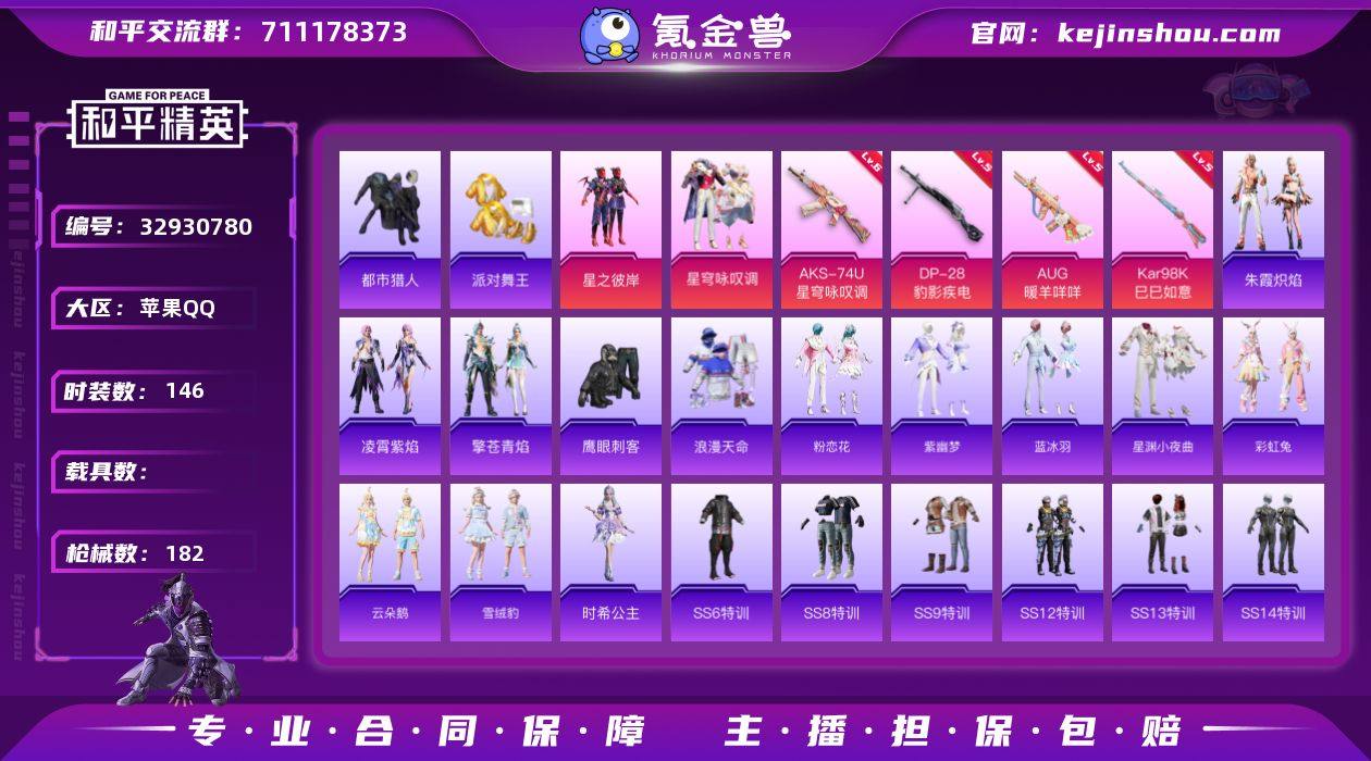 苹果 手Q-2粉装-6特效枪-0载具-1粉色飞行器-50817热力值-7王牌印记-146套装-182枪皮 【热门品类】:套装-浪漫天命,套装-都市猎人,套装-派对舞王 【粉色套装】:粉装-星之彼岸,粉装-星穹咏叹调 【粉色枪皮等级】:AUG-暖羊咩咩(五级),ACE32-萌骑漫游(五级),AKS-74U-星穹咏叹调(六级),Kar98K-巳巳如意(五级),Mk14-福马献瑞(四级),DP-28-豹影疾电(五级) 【粉色枪皮】:AUG-暖羊咩咩,ACE32-萌骑漫游,AKS-74U-星穹咏叹调,Kar98K-巳巳如意,Mk14-福马献瑞,DP-28-豹影疾电 【粉色飞行器】:幻骨萌王飞行器 【粉色降落伞】:锦绣火鲤降落伞,星之彼岸降落伞,齐天大圣降落伞,蓝莓炮弹降落伞,星穹咏叹调降落伞,时光之誓降落伞,荧海星豚降落伞,虎痴许褚降落伞 【稀有套装】:套装-马上来财,套装-粉恋花,套装-紫幽梦,套装-蓝冰羽,套装-星渊小夜曲,套装-彩虹兔,套装-云朵鹅,套装-雪绒豹,角色-时希公主,套装-朱霞炽焰,套装-凌霄紫焰,套装-擎苍青焰,套装-雨过天青,套装-红釉青花,角色-枫露凝珀 【稀有枪皮】:AKM-四圣焕新,AKM-夜灯,AKM-彩虹符号,AKM-影袭,AKM-破晓战魂,AKM-虎虎生威,AKM-霓虹街区,AKM-龙的传人,M16A4-红色方程式,M16A4-绒绒猫尾,...
