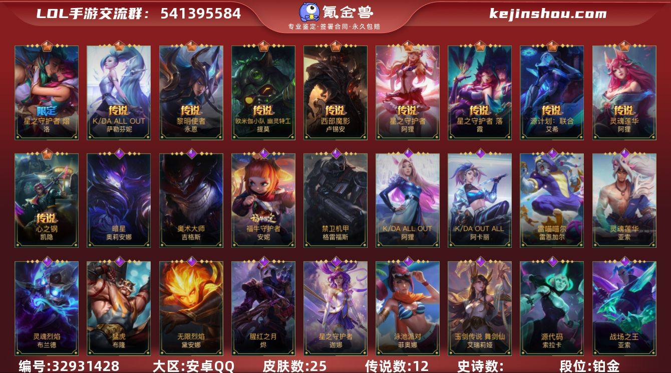 WLSY510【12传说 25史诗】安卓Q-60英雄-71皮肤-12传说 段位:铂金【传说】西部魔影卢锡安 告白气球拉克丝 春晖神裔辛德拉 星之守护者落霞 源计划:联合艾希 神王德莱厄斯 欧米伽小队幽灵特工提莫 星之守护者阿狸 灵魂莲华阿狸 心之钢凯隐 K/DA ALLOUT萨勒芬妮 黎明使者永恩【皮肤】K/DA ALLOUT萨勒芬妮 欧米伽小队 幽灵特工 神王德莱厄斯 西部魔影卢锡安 星之守护者阿狸 黎明使者永恩 灵魂莲华阿狸 心之钢凯隐 星之守护者 落 腥红之月烬 星之守护者风女 灵魂莲华亚索 战场之王亚索 战斗学院卡特 泳池派对剑姬 源代码索拉卡 玉剑传说 舞剑仙 霸天剑魔亚托克斯 屠龙勇士凯尔 猛虎布隆 雷喵喵尔 禁卫机甲 K/DA ALL OUT阿狸 K/DA ALL OUT阿卡丽 灵魂烈焰 暗星发条 奥术大师吉格斯 福牛守护者安妮 无限烈焰 s7绯金战斧 s9王牌舰长