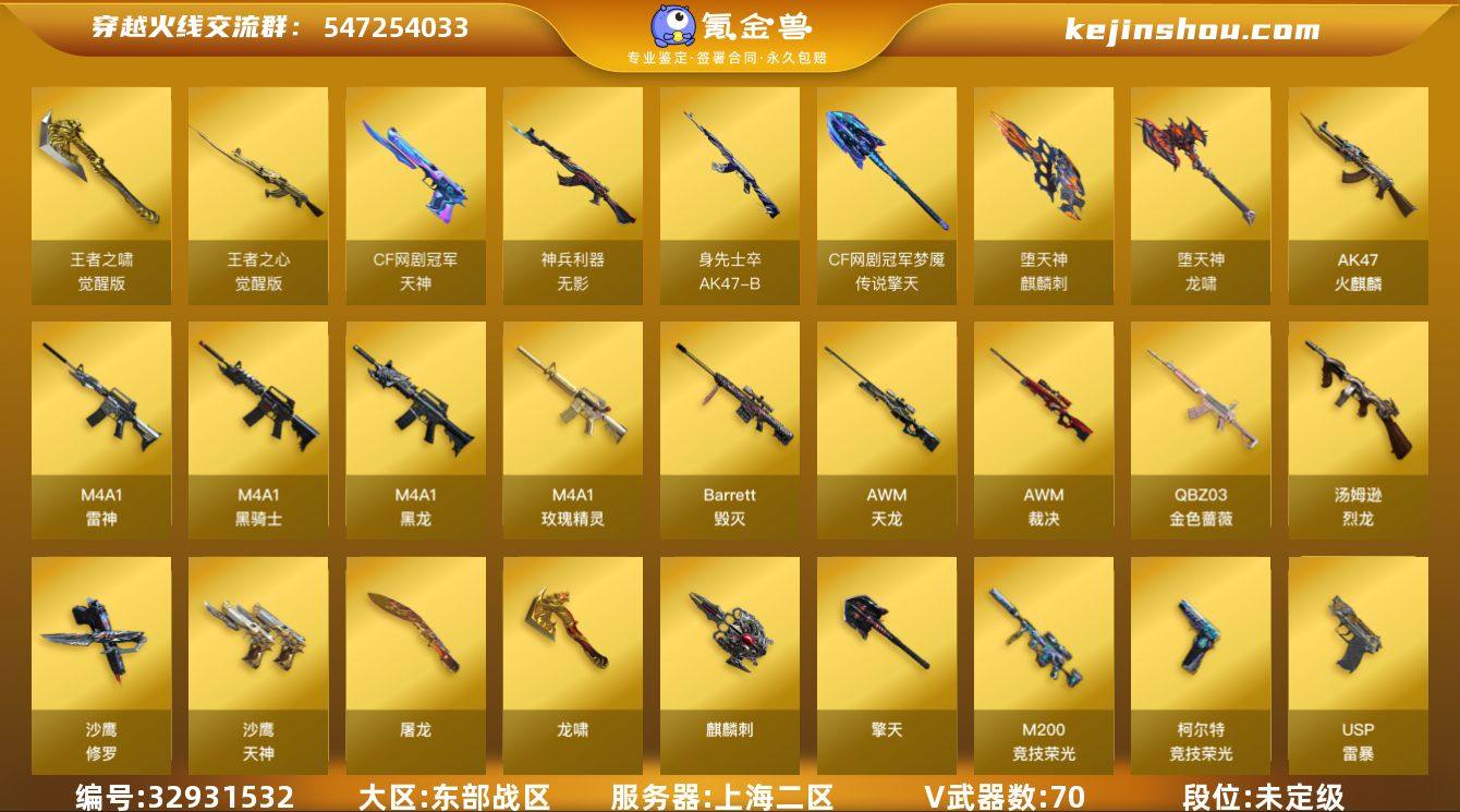 上海二区-77V-5王者武器数-0炫金武器数 【热门武器】:QBZ03-金色蔷薇,M200-竞技荣光,M4A1-黑骑士,汤姆逊-烈龙*3,斯泰尔-蝴蝶,USP-雷暴,沙鹰-修罗,金刚伞 【音效卡】:屠龙-动感闪耀 音效卡,M4A1-雷神音效卡,M4A1-黑骑士音效卡,Barrett-毁灭音效卡,绝迹语音包 【皮肤】:雷神-暗月,雷神-能量核心,雷神-宠儿-2019MVP,火麒麟-AG战队皮肤,火麒麟-雷神,火麒麟-平天大圣,火麒麟-百城,毁灭-荣耀之怒,毁灭-黑大圣皮肤,黑骑士-暗月,战神-粉色甜心皮肤,战神-紫绶金章皮肤,AK47-B-常胜将军-曹操,AK47-B-常胜将军-孙权,天龙-能量核心,AWM-天龙-传奇70KG 【角色】:魅影,电竞教官-云悠悠,王者-瞳-闭月羞花,王者葵-惊若翩鸿,王者复仇,王者涂鸦,狐影,乔伊教练,暗夜-X,暗夜审判,初恋灵狐,嘉年华灵狐,娟娟,灵狐者-X,灵狐者-黄金海岸,灵狐者-七夕宝贝,龙儿-小淘气,潘多拉-X,潜龙队-X,青霞仙子,斯沃特-X,蜀雪,铁骑荣耀,新娜塔莎,影武者-X,职业选手 【人偶武器】:M4A1-雷神-精英刀锋,斯泰尔-蝴蝶,AWM-灵狐-15周年嘉年华,迷你深渊冰龙,迷你波特博士,夺魂*2,迷你生化手雷,深渊终结者手雷,闪光弹-貂蝉,高爆手雷-大乔,迷你巨石泰坦-魔...