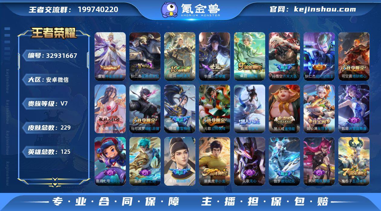 AL693558 【退游一手老号|陪伴5年,无违规可验】 皮肤数229 星传说皮肤数1 英雄数125 营地id1792463575 贵族等级【文本】贵族7级 【贵族7级】 星元皮肤1 荣耀典藏1 内测皮肤3 限定皮肤74 赛季限定25 史诗皮肤67 战令限定21 勇者皮肤113 其他皮肤43 星元皮肤:狄仁杰星际治安官; 荣耀典藏:虞姬神鉴启示录; 内测皮肤:姬小满妄想食味,孙尚香蔷薇恋人,艾琳女武神; 限定皮肤:姬小满妄想食味,牛魔星界战将,吕布逐霄战戟,杨玉环遇见飞天,桑启鸣野蒿,李元芳银河之约,孙悟空神迹守卫,亚连破空之剑,李白谪仙醉月,盘古敬我三分,大司命东方月初,刘邦剑破天穹,鲁班七号蔬乡物语,李元芳蔬乡物语,沈梦溪龙舞盛年,高渐离燃音魔法,妲己灵卜魔法,嫦娥如梦令,伽罗琥珀纪元,嫦娥漠中幻影,鬼谷子天穹祈灯,蒙恬荣光圣徽,艾琳流音漫舞,司空震地狱燃心,阿古朵江河有灵,张良古海寻踪,西施玲珑珍味,戈娅驭风魔法,孙尚香蔷薇恋人,鲁班大师探海日志,裴擒虎擒涛扼浪,暃星界游侠,孙悟空齐天大圣,嫦娥暖冬兔眠,狄仁杰魔术师,桑启海盐诗旅,梦奇顽趣,元歌无心,鬼谷子五谷丰年,李元芳云中旅人,沈梦溪大漠名商,兰陵王金庭之子,黄忠火炮绅士,百里玄策原初追逐...