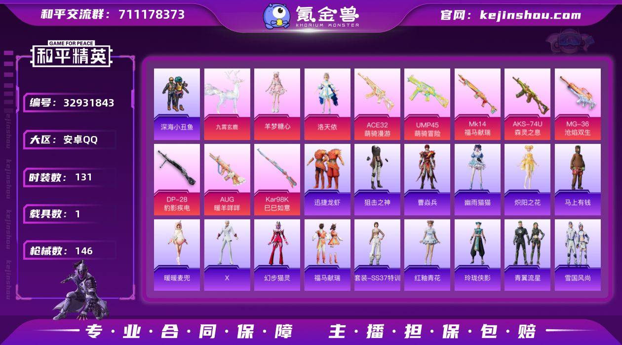 【1载具 8特效枪 2粉装 146枪皮 131套装】女号 地铁号 三万热力值 九霄玄鹿 浪漫天命,暗影哥特,深海小丑鱼,洛天依,羊梦糖心 ACE32-萌骑漫游,AUG-暖羊咩咩,Kar98K-巳巳如意,Mk14-福马献瑞,UMP45-萌骑冒险,AKS-74U-森灵之息,MG-36-沧焰双生,DP-28-豹影疾电 挂凌工作青 df54-51,编号:WPVFT41