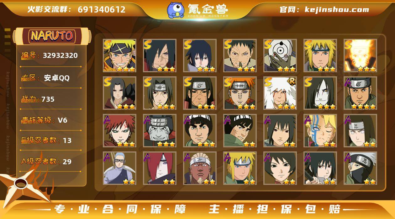 【2680】可免费转苹果 V6 735万战力 13S-29A 止水55片 TT1895 【S级忍者】:千手柱间「秽土转生」(3星),宇智波鼬「秽土转生」(3星),宇智波斑「秽土转生·解」(3星),宇智波带土「忍界大战」(3星),宇智波鼬「须佐能乎」(3星),自来也「舞之豪杰」(3星),大蛇丸(3星),波风水门(3星),漩涡鸣人「九喇嘛连结」(3星),佩恩「天道」(3星),宇智波佐助「永恒万花筒」(3星),宇智波斑 「白面具」(3星宇智波斑「白面具」),漩涡鸣人·宇智波佐助(3星) 【A级忍者】:艾「青年」(2星),长门「青年」(2星),波风水门「青年」(2星),奇拉比(2星),飞段(2星),飞段「死司凭血」(2星),干柿鬼鲛(3星),漩涡博人「桃式显现」(2星),漩涡鸣人「九尾查克拉」(2星),迈特凯(3星),旗木卡卡西「忍界大战」(2星),旗木卡卡西「万花筒写轮眼」(2星),我爱罗「疾风传」(3星),蝎(2星),小南「神驹佑将」(2星),角都「地怨虞」(2星),猿飞阿斯玛(4星),猿飞阿斯玛「秽土转生」(2星),宇智波鼬(2星),宇智波佐助「须佐能乎」(2星),宇智波佐助「万花筒写轮眼」(2星),照美冥「五代目水影」(2星),日向宁次「忍界大战」(2星),长十郎「六代目水影」(2星),黑土「博人传」(2星),秋道丁次「忍界大战」(2...