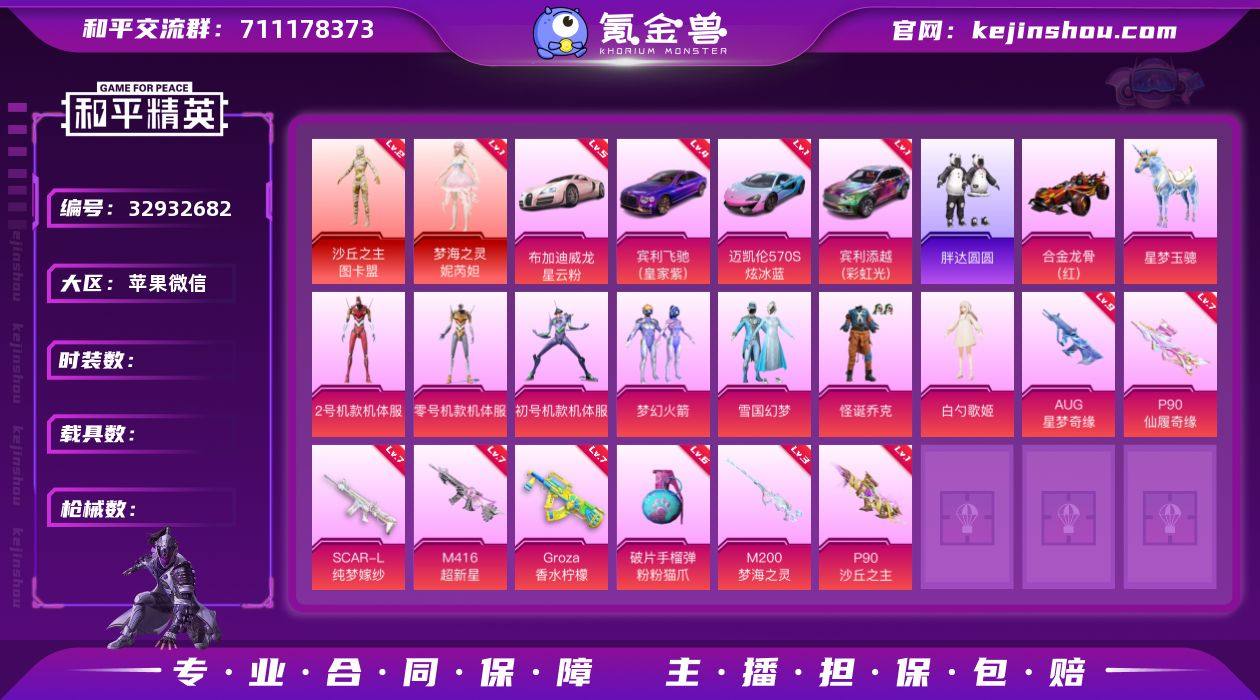 编号72024 果V可改,🆔尚,战神框,20印记,地铁满天赋,2级图卡盟,妮芮妲,新老101,木乃伊,雪国,小丑,天网,三色螳螂,飞龙,树人,洛天依,白勺,第五大道,奶龙,放客,5级威龙,4级飞驰,添越,迈凯伦,红蹦蹦,星梦玉骢,满级星梦奇缘,超新星,仙履奇缘,梦海之灵,沙丘之主,甜心AK,31特5计数,33粉2红,16载具,送璀璨碎片