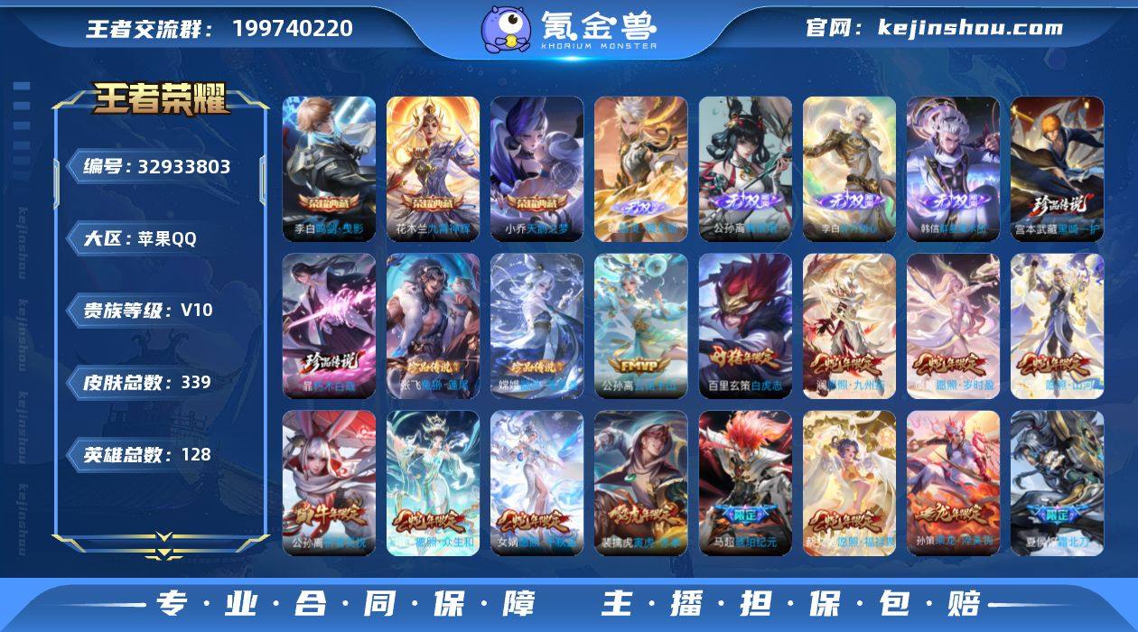 实名: 可修改 性别: 男号 贵族等级: V10 英雄数: 128 皮肤数: 339 荣耀水晶: 天鹅之梦,鸣剑·曳影,九霄神辉 无双皮: 碎月剑心,韩信群星魔术团,离恨烟,器灵·螭龙剑 珍品传说: 器灵·落星盏,兔狲·蓬尾,朽木白哉,黑崎一护 传说皮: 黄金狮子座,云鹰飞将,黄金白羊座,猫影幻舞,炽阳神光,一念神魔,末日机甲-孙尚香,地狱火,地狱之眼,乞巧织情,淬星耀世,无双飞将,炽翼辉光,浮生妄,记忆之芯,百相守梦(张飞),电玩·雷克斯,惊梅引,霜月吟,澜逐花归海,艾琳觅芳踪,琥珀纪元马超,乘龙·问璇玑,乘龙·铭钟鼎,乘龙·淬吴钩,云中君群星魔术团,铠冥王哈迪斯,玄雷天君,幻光神枪,祥瑞亨通,千劫归真,云诺千山 限定皮: 冰锋战神,李小龙,祈雪灵祝,梁祝,时雨天司,龙胆,白鹤梁神女,武圣,辉光之辰,白晶晶,天魔缭乱,神威,蜜橘之夏,冰霜恋舞曲,白虎志,玄武志,至尊宝,一生所爱,大圣娶亲,孙行者,寅虎·赤拳,玉兔公主,启示之音,前尘镜,五谷丰年,绯月行,诗剑行,怒海麟威,山海·玄木吟,冰霜神祇,齐天大圣,夏侯惇霜北刀,鸣野蒿,陌上桑,逐霄战戟,愿照·千秋盛,愿照·众生和,愿照·山河定,愿照·岁时盈,愿照·福禄聚,愿照·九州拓 亮点: 【优质装备】:天鹅之梦(小乔典藏),鸣剑·曳影,九霄神辉(木兰典藏),碎月剑心(李白无双),韩信群...