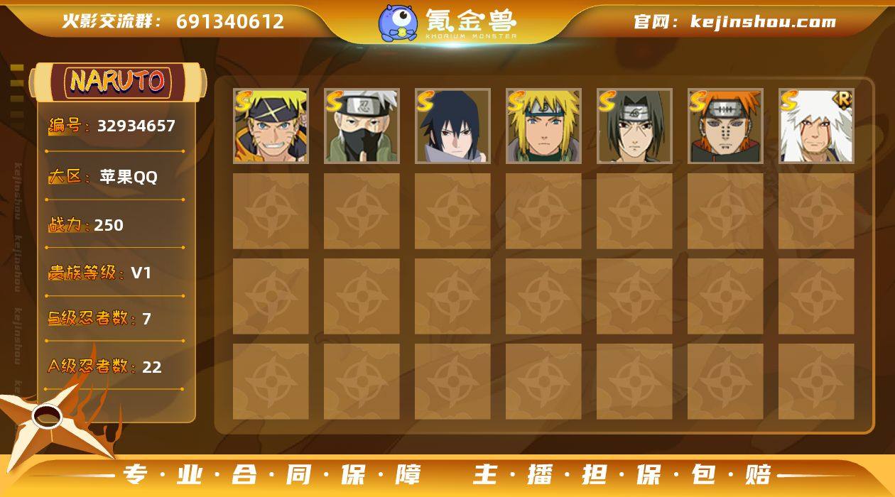 实名: 可修改 贵族等级: V1 S忍数: 7 A忍数: 22 战力值(万): 250 S级忍者: 佩恩「天道」,波风水门,宇智波鼬 「须佐能乎」,自来也 「舞之豪杰」,宇智波佐助「永恒万花筒」,旗木卡卡西「须佐能乎」,漩涡鸣人·宇智波佐助 亮点: 【优质装备】:宇智波佐助「永恒万花筒」,旗木卡卡西「须佐能乎」霸体lv4