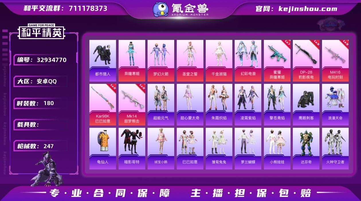 【kyhp1431】安卓 手Q-5粉装-7特效枪-0载具-3粉色飞行器-70812热力值-14王牌印记-180套装-247枪皮 【热门品类】:粉装-梦幻火箭,套装-浪漫天命,套装-都市猎人,套装-龟仙人,套装-暗影哥特 【粉色套装】:粉装-梦幻火箭,角色-圣堂之誓,角色-千金淑猫,粉装-幻彩电音,角色-异瞳寒姬 【粉色枪皮等级】:M416-电玩时刻(五级),蜜獾-异瞳寒姬(七级),Kar98K-巳巳如意(五级),Mk14-甜梦熊击(五级),Mk14-福马献瑞(四级),AA12-G-萌骑幻想(四级),DP-28-豹影疾电(五级) 【粉色枪皮】:M416-电玩时刻,蜜獾-异瞳寒姬,Kar98K-巳巳如意,Mk14-甜梦熊击,Mk14-福马献瑞,AA12-G-萌骑幻想,DP-28-豹影疾电 【粉色飞行器】:炫彩糖果飞行器,万象金身飞行器,墨金战记飞行器 【粉色降落伞】:幻影战神降落伞,蓝莓炮弹降落伞,第五大道降落伞,飒粉甜心降落伞,未来歌姬降落伞,圣堂之誓降落伞,精灵梦叶罗丽降落伞,守护天翼降落伞,冷漠罗丽降落伞,无垠阁降落伞,异瞳寒姬降落伞,炫彩糖果降落伞 【稀有套装】:套装-龟仙人,套装-绒宝小鹅,套装-巳巳如意,套装-超能元气,角色-甜心蒙太奇,套装-雪国风尚,套装-炫彩糖果,套装-马上有钱,套装-迅捷龙虾,套装-雏菊兔兔,套装-...