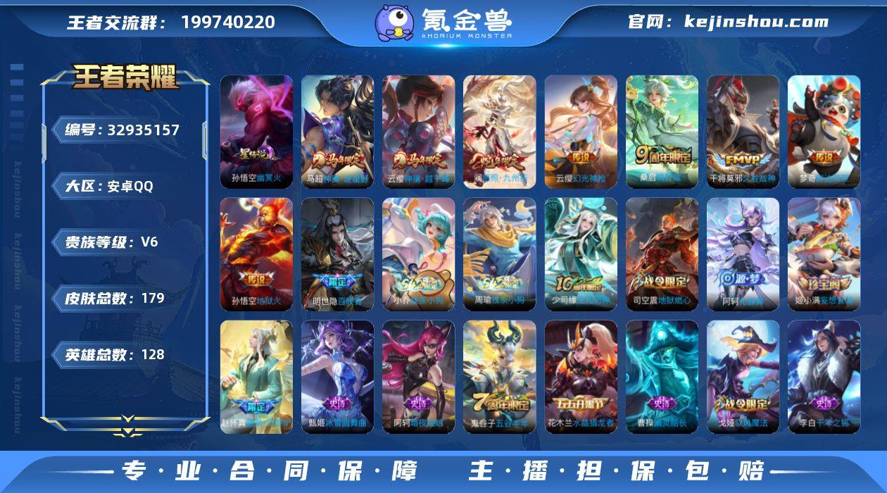 【特价急出/详情看图】安卓Q-V6-最强王者段位-128英雄-179皮肤-1星元-8传说-40史诗 【英雄全皮】:孙权全皮,敖隐全皮 【传说皮肤】:云缨神骥越千峰,马超神骥逐星野,澜愿照九州拓,云缨幻光神枪,桑启鸣野蒿,干将莫邪久胜战神,梦奇胖达荣荣,孙悟空地狱火 【限定皮肤】:蒙犽顽岩魄,大乔绒语心约,姜子牙天穹之誓,杨戬破阵退雄兵,狄仁杰阴阳师,赵云皇家上将,狄仁杰魔术师,项羽海滩派对,女娲朔望之晖,鬼谷子五谷丰年,百里玄策原初追逐者,裴擒虎擒涛扼浪,云中君纤云弄巧,西施玲珑珍味,鲁班大师探海日志,戈娅驭风魔法,艾琳流音漫舞,司空震地狱燃心,阿古朵江河有灵,张良古海寻踪,蒙恬荣光圣徽,高渐离燃音魔法,妲己灵卜魔法,鬼谷子天穹祈灯,姬小满妄想食味,沈梦溪龙舞盛年,鲁班七号蔬乡物语,李元芳蔬乡物语,刘邦剑破天穹,程咬金群星魔术团,周瑜熔金海岸 【年限皮肤】:澜愿照九州拓 【赛季限定】:裴擒虎擒涛扼浪,鲁班大师探海日志,张良古海寻踪,鬼谷子天穹祈灯,刘邦剑破天穹,姜子牙天穹之誓,东皇太一噬灭天穹,太乙真人谧流熔炉,钟馗虚灵犬护,亚瑟荣光之誓,百里玄策原初追逐者,蒙恬荣光圣徽,牛魔星界战将 【战令限定】:女娲朔望之...