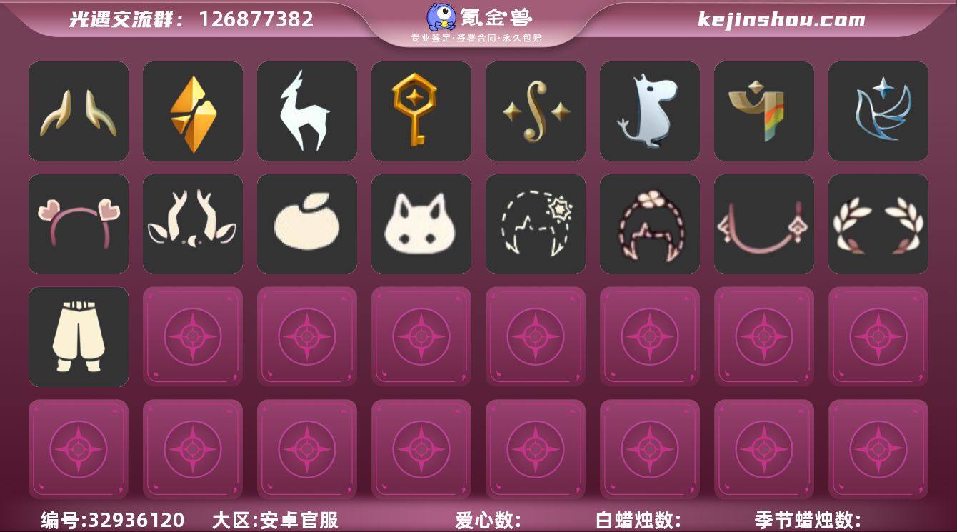 账号类型: 手机账号 季节已毕业: 破晓季,九色鹿季,筑巢季,二重奏季,姆明季,彩染季,青鸟季,织光季 完成地图: 无 礼包: 九色鹿角,橘子,兔子,雪花,四叶草,新年耳钉,锦标赛桂冠,心心相印发饰礼包 裤子: 武士裤