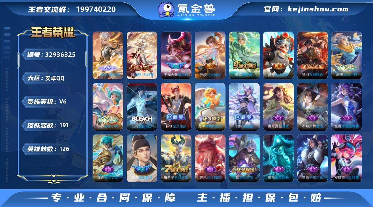 实名: 可修改 贵族等级: V6 英雄数: 126 皮肤数: 191 无双皮: 器灵·螭龙剑 传说皮: 胖达荣荣,幻光神枪 限定皮: 梁祝,五谷丰年,绯月行,鸣野蒿,逐霄战戟,愿照·九州拓 亮点: 【WZ182000】191皮肤-1无双-5传说-40史诗【英雄全皮】:孙权全皮,影全皮【无双皮肤】:曜器灵螭龙剑【传说皮肤】:澜愿照九州拓,云缨幻光神枪,桑启鸣野蒿,不知火舞绯月行,梦奇胖达荣荣【限定皮肤】:姜子牙天穹之誓,李白谪仙醉月,狄仁杰阴阳师,赵云皇家上将,孙尚香蔷薇恋人,高渐离玩趣恶龙,白起夜都怪侠,芈月幻夜卜梦,狄仁杰魔术师,狄仁杰万华元夜,达摩沙漠行僧,项羽海滩派对,程咬金演武夺筹,兰陵王金庭之子,不知火舞绯月行,李元芳云中旅人,钟馗驱傩正仪,鬼谷子五谷丰年,沈梦溪大漠名商,明世隐吟游魔法,裴擒虎擒涛扼浪,上官婉儿梁祝,嫦娥暖冬兔眠,鲁班大师探海日志,桑启海盐诗旅,暃星界游侠,张良古海寻踪,高渐离燃音魔法,妲己灵卜魔法,鬼谷子天穹祈灯,沈梦溪龙舞盛年,鲁班七号蔬乡物语,刘邦剑破天穹,上官婉儿群星魔术团,程咬金群星魔术团,镜青焰无极,项羽苍威无极,刘备异域游侠,芈月浮光幕影,周瑜熔金海岸【年限皮肤】:澜愿照九州拓【赛季限定】:狄仁杰万...