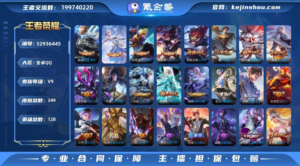 【WZSA1541】贵族9/皮肤349/典藏4/传说18/史诗95/英雄128/鬼谷子全皮/猪八戒全皮/敖隐全皮/孙悟空-全息碎影/孙尚香-杀手不太冷/李白-鸣剑·曳影/伽罗-最初的交响/后羿神树通天/桑启-鸣野蒿/马超-无双飞将/孙策-挚爱之约/赵云-淬星耀世/曜-李逍遥/小乔-音你心动/公孙离-祈雪灵祝/诸葛亮-时雨天司/铠-绛天战甲/虞姬-启明星使/李信-一念神魔/貂蝉-猫影幻舞/张良-黄金白羊座/百里玄策-白虎志/李白-凤求凰/宫本武藏-地狱之眼/孙悟空-地狱火/白起-狰/姜子牙-天穹之誓/狄仁杰-阴阳师/小乔-纯白花嫁/虞姬-凯尔特女王/赵云-皇家上将/墨子-神迹守卫/妲己-热情桑巴/嬴政-优雅恋人/嬴政-白昼王子/鲁班七号-狮舞东方/庄周-蜃楼王/庄周-高山流水/高渐离-死亡摇滚/阿轲-迷踪丽影/孙膑-妖精王/扁鹊-炼金王/白起-夜都怪侠/芈月-重明/吕布-猎兽之王/周瑜-赤莲之焰/元歌-云间偶戏/元歌-无心/夏侯惇-朔风刀/夏侯惇-匿光决锋者/甄姬-游园惊梦/曹操-烛龙/典韦-穷奇/典韦-蓝屏警告/马可波罗-暗影游猎/狄仁杰-魔术师/狄仁杰-万华元夜/达摩-星际陆战队/达摩-沙漠行僧/项羽-海滩派对/项羽-霸王别姬/老夫子-醍醐杖/老夫子-航海奇遇记/程咬金-演武夺筹/刘邦-夺宝奇兵/王昭君-凤凰于飞/兰陵王-驯魔猎人/兰陵...