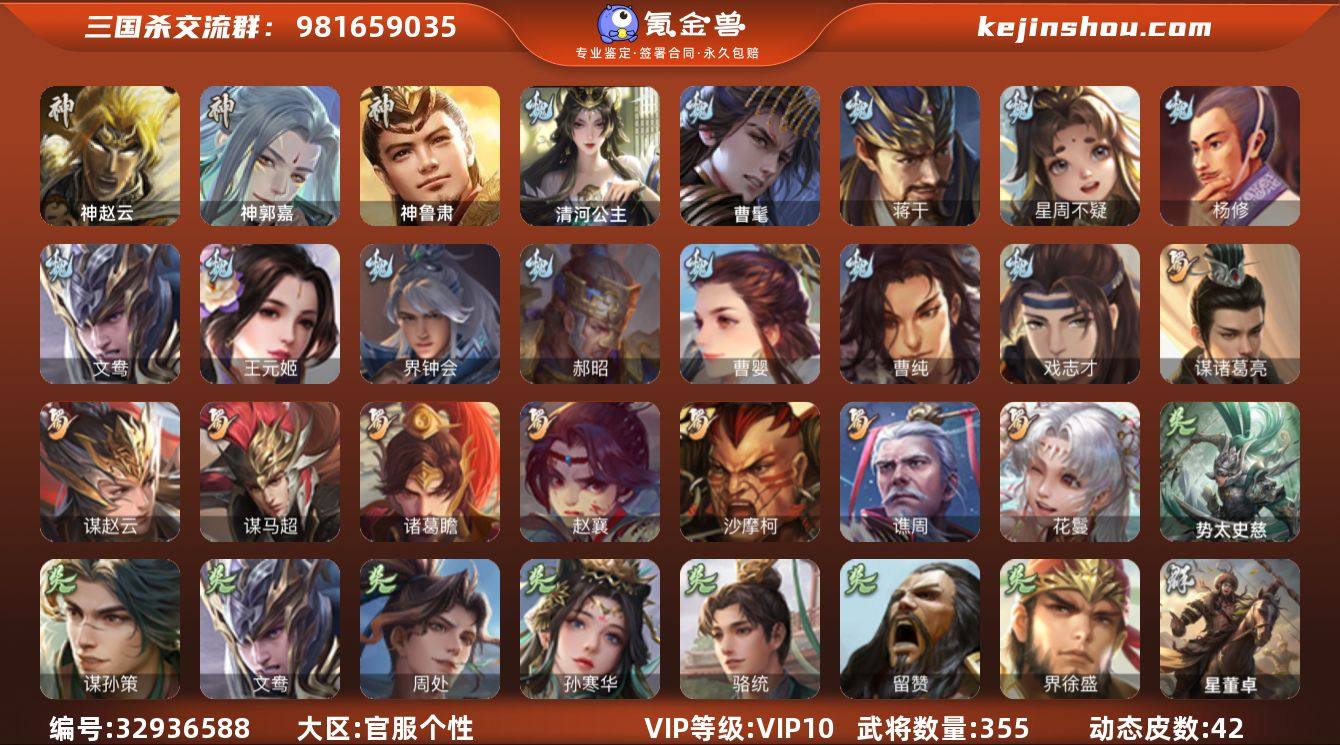【713】官阶:大将军;VIP等级:VIP10;史诗武将数量:45;动态皮肤数量:42;武将总数:355;史诗宝珠数量:20;将魂数量:6118;神将:5;魏国史诗武将:23;蜀国史诗武将:8;吴国史诗武将:7;群史诗武将:19
