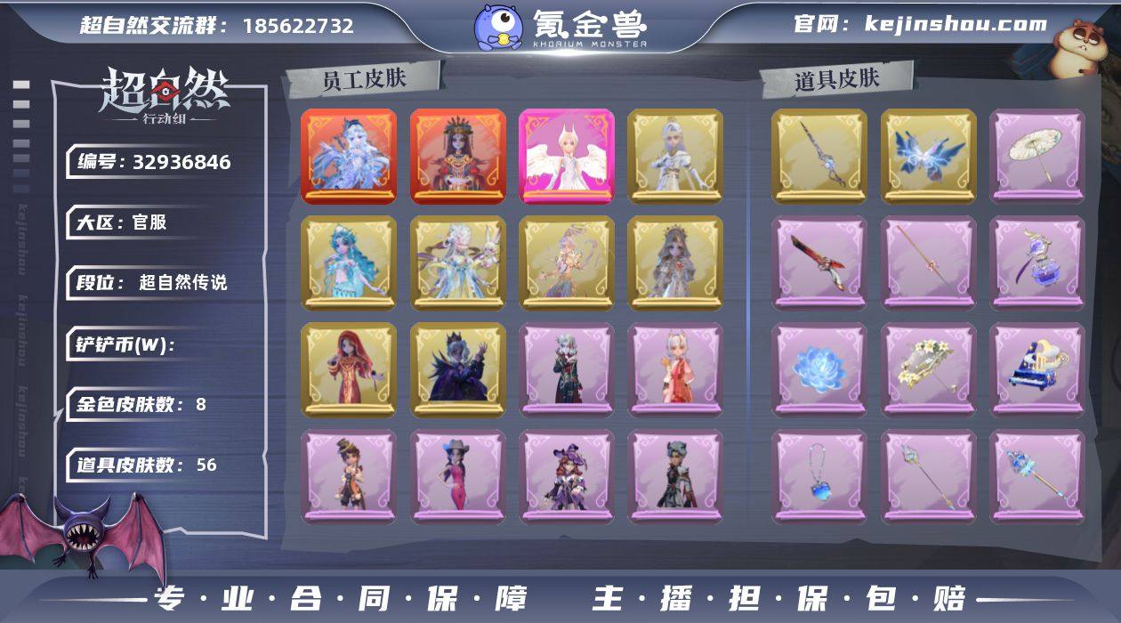 超自然行动组成品号,2红1粉14紫,薇薇安全皮,白泽莉莉伪全皮大情号,氪条6k+,兔宝剩余20天,道具皮多,铲铲币充足,梦居全满瑕轩辕,总资产1亿+,账号干净可换绑,支持全平台互通。账号安全,细节看图,喜欢直接拍,价格可聊,诚心要可小刀。
