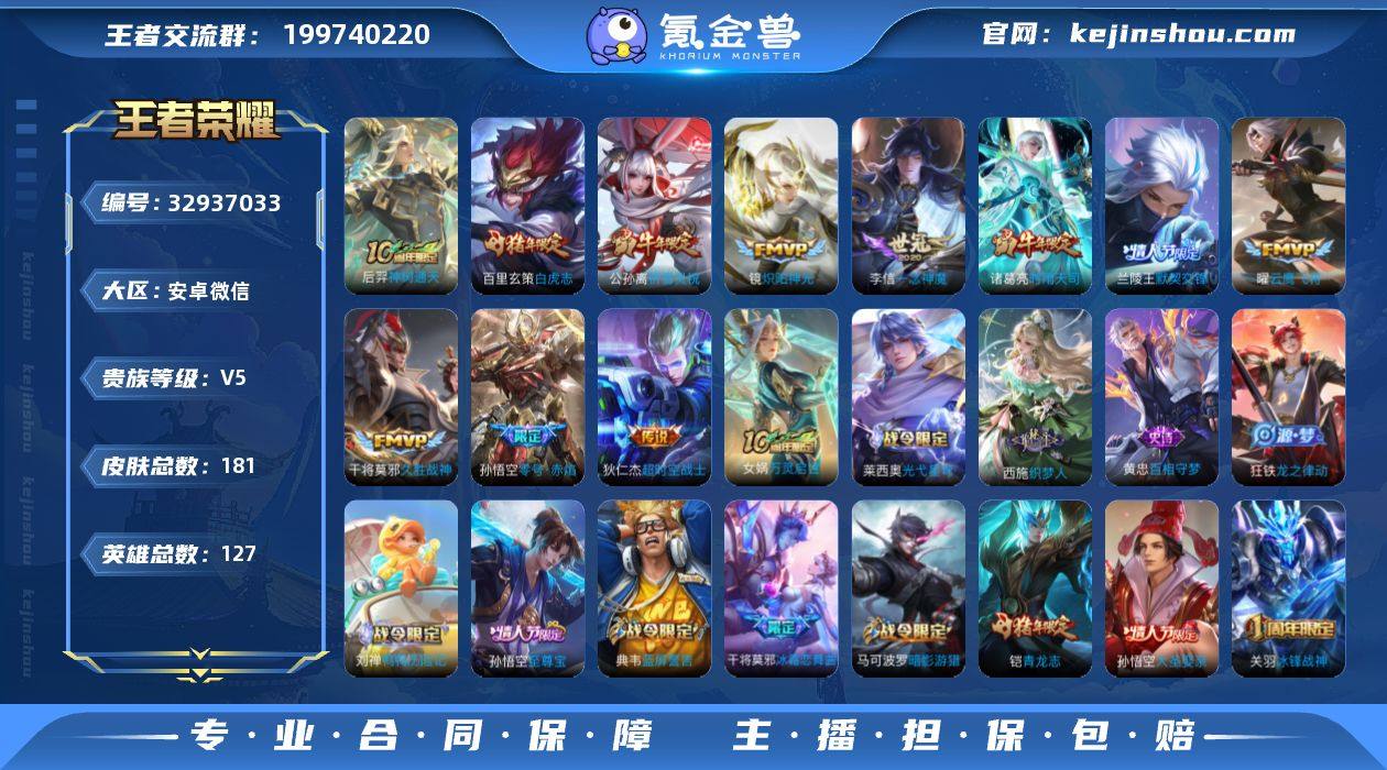 安卓WX-V5-至尊星耀V段位-127英雄-181皮肤-11传说-57史诗