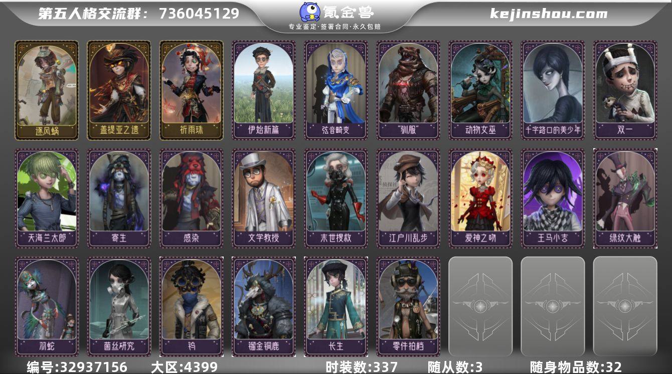 有王马小吉,爱神之吻,双一。十字路口美少年及其他的一些小限定,19年的号ad挺短的,19还是20我忘了,在这个区间头像200多个,头像框也差不多了,有一个鹿头的限定背饰,金挂也挺多的,紫皮也挺多的,337个皮肤,剩下的自己看